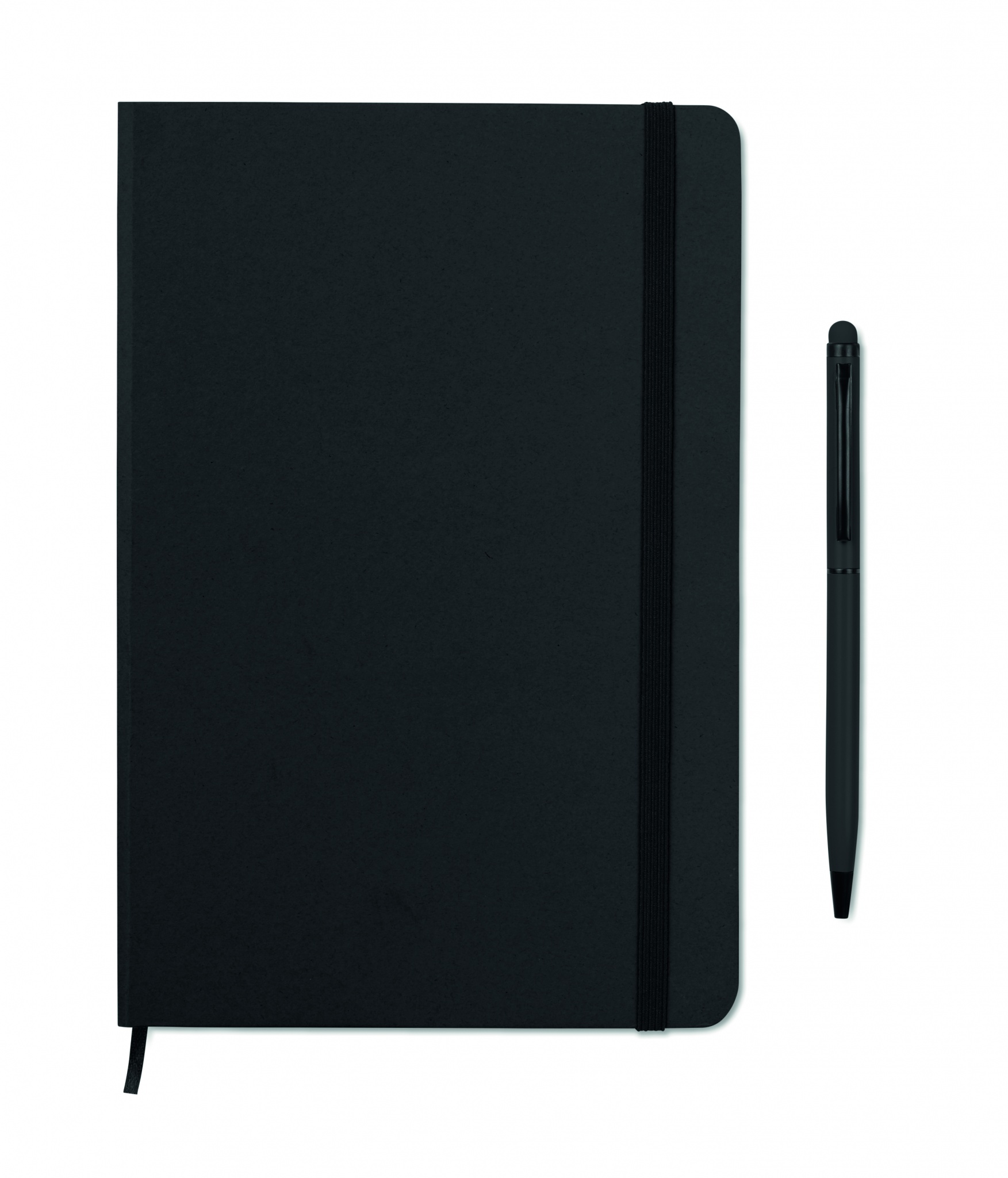 DIN A5 Notizbuch mit Hard Cover aus PU. 72 Blatt (144 Seiten) liniertes Papier. Farblich abgestimmter Kugelschreiber mit Stylus. Blaue Tinte. Elastisches Verschlussband, Lesebändchen und Stiftschlaufe.