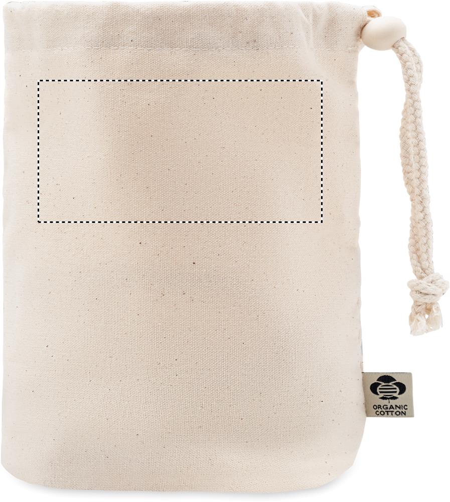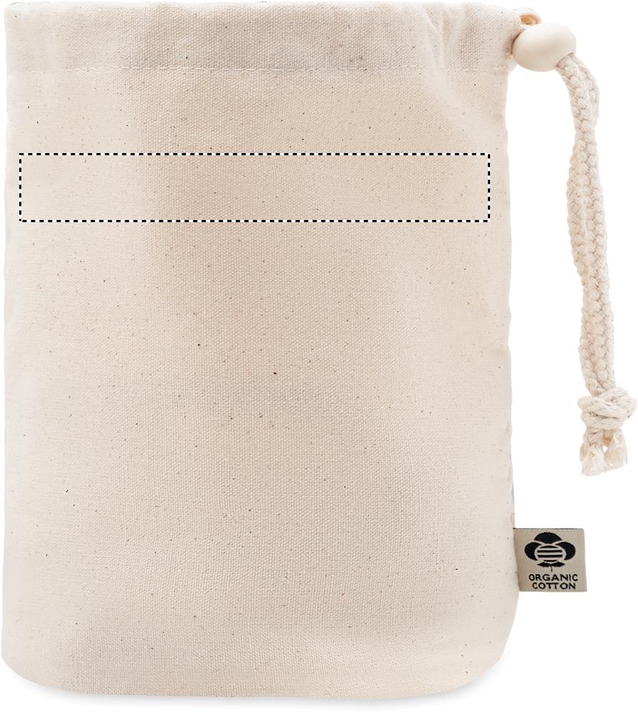 Kleine Aufbewahrungstasche für Accessoires. Organic Cotton 220 g/m². Sie hat innere Netzfächer und einen Kordelstopper aus Holz.