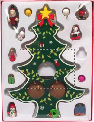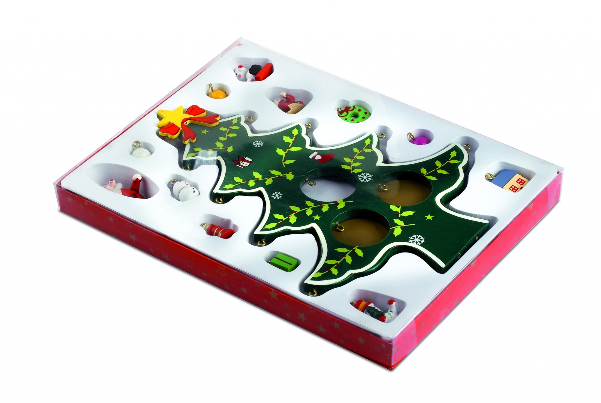 Dekoration aus Holz. In Form eines Weihnachtsbaumes mit 12 verschiedenen Deko-Anhängern. Lieferung in einer Geschenkbox mit transparentem Deckel.
