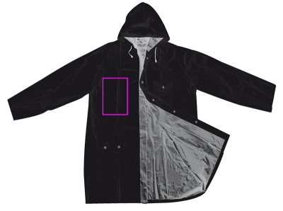 Wendbare PVC-Regenjacke mit Kapuze, zwei Taschen und Druckknöpfen. Rückseite des Mantels – 103 x 60 cm.