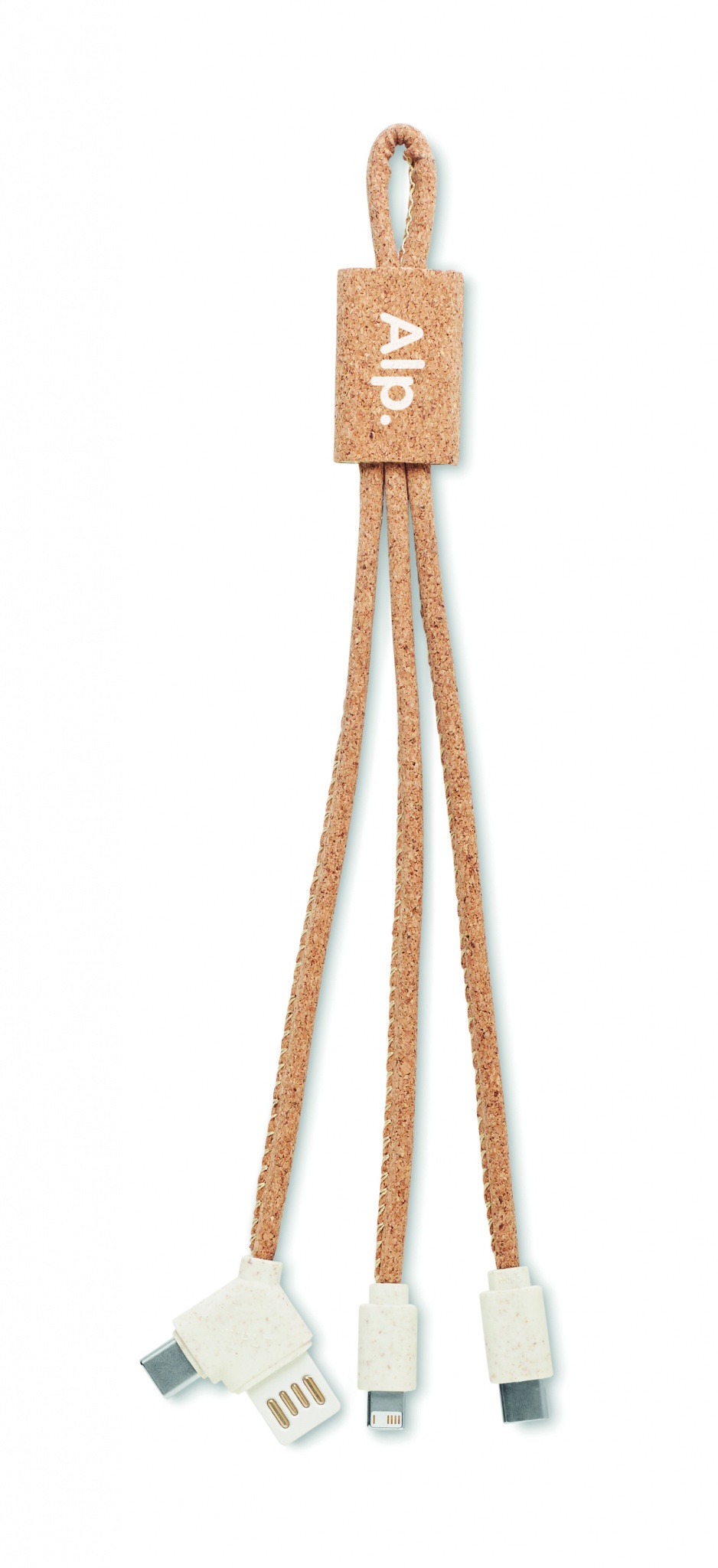 Cork 3-in-1 charging cable. Input Type A and type C. Output 3 types. Cork is 100% natural material. Due to its structural nature and surface porosity the final print result per item may have deviations.
