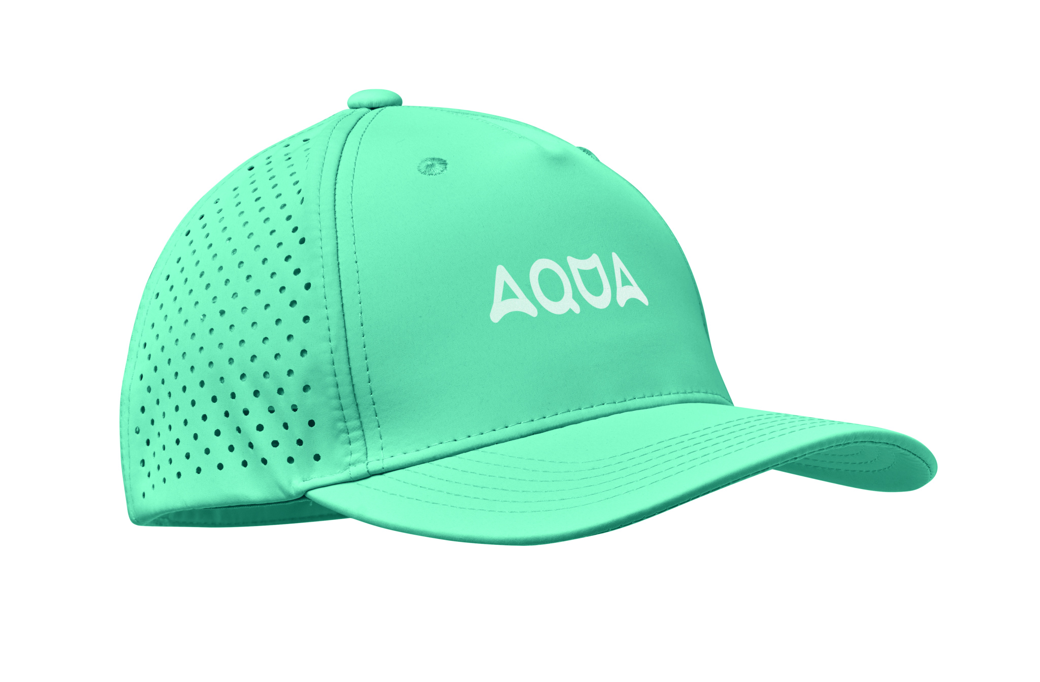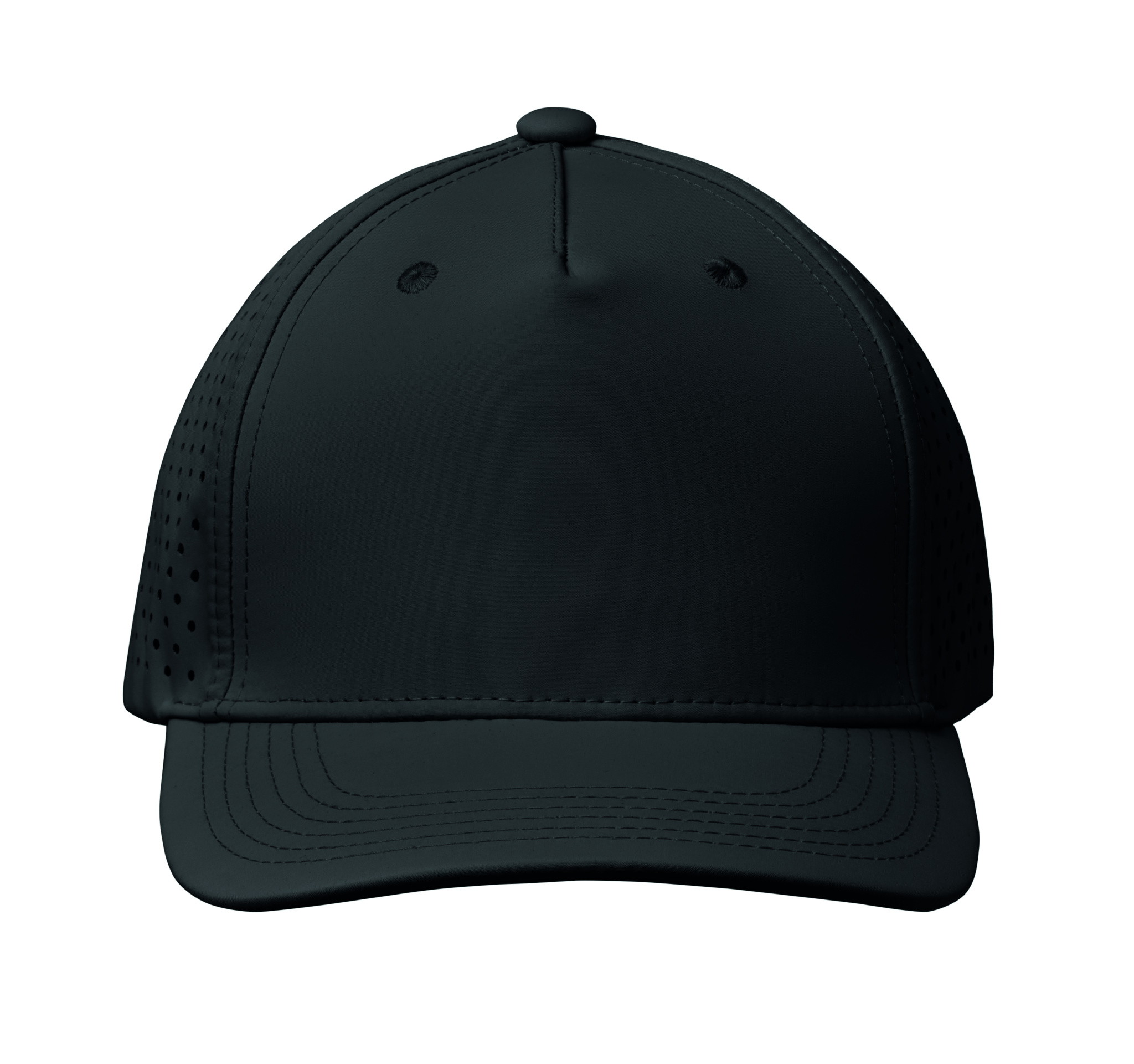 5 panel polyester performance cap with adjustable hook and loop closure and laser perforated holes with 2 stitched eyelets in matching colour. Item is quick dry, sweat and water repellent. 200 gr/m²