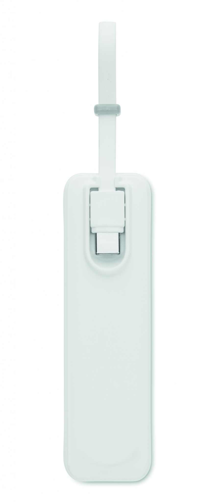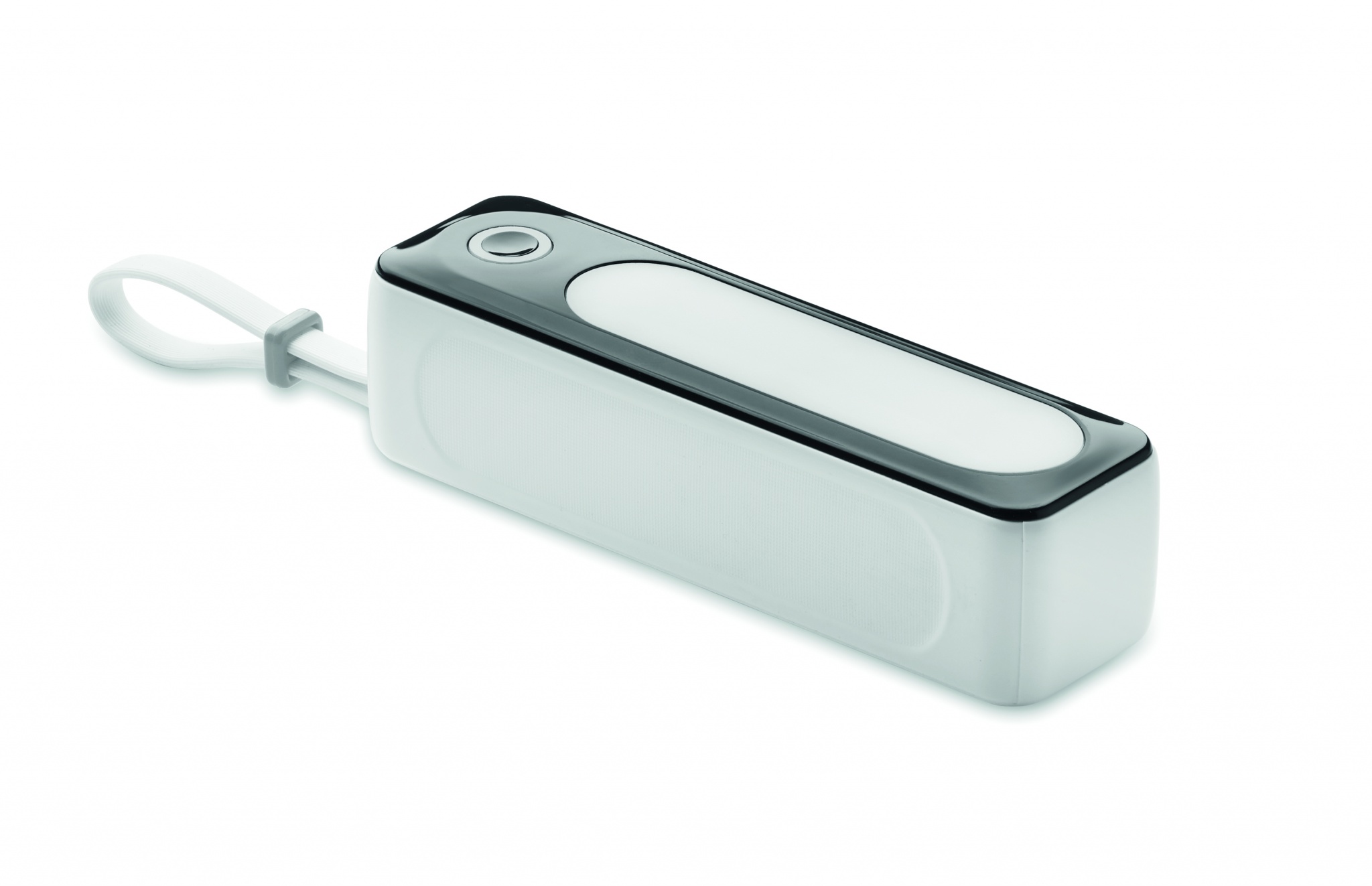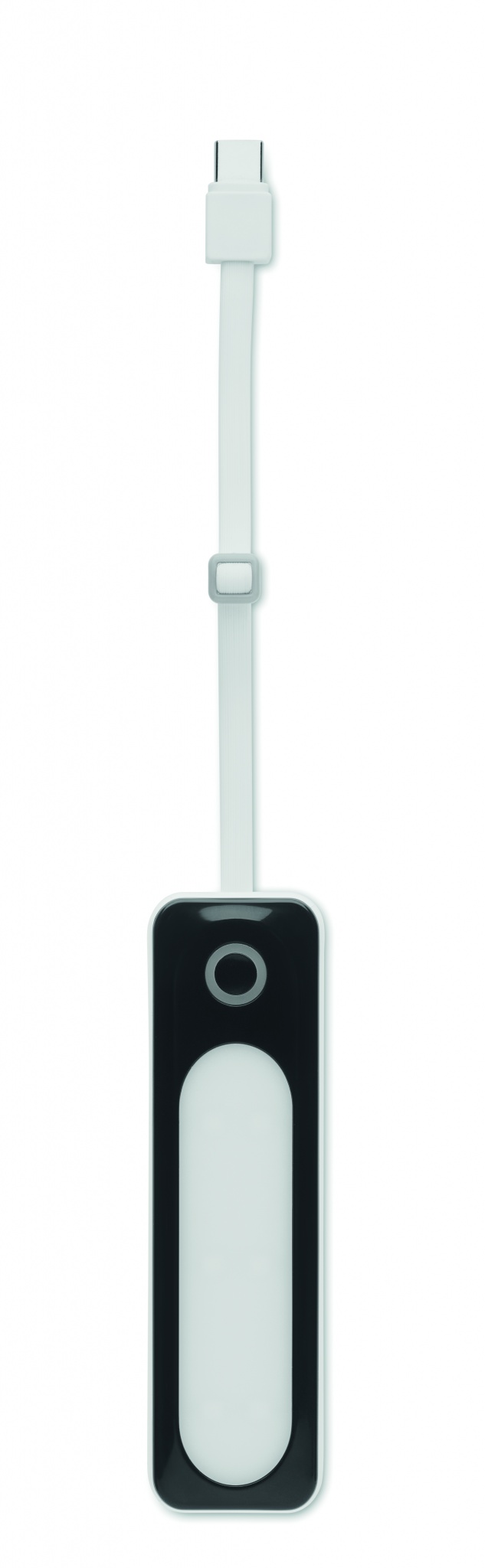 Power bank 5000 mAh capacity in abs casing. Output current DC5V/2A 1x type A and 1x type C in/out. Includes indicating 4 light setting (6 COB led) and integrated USB cable with Type C plug output.