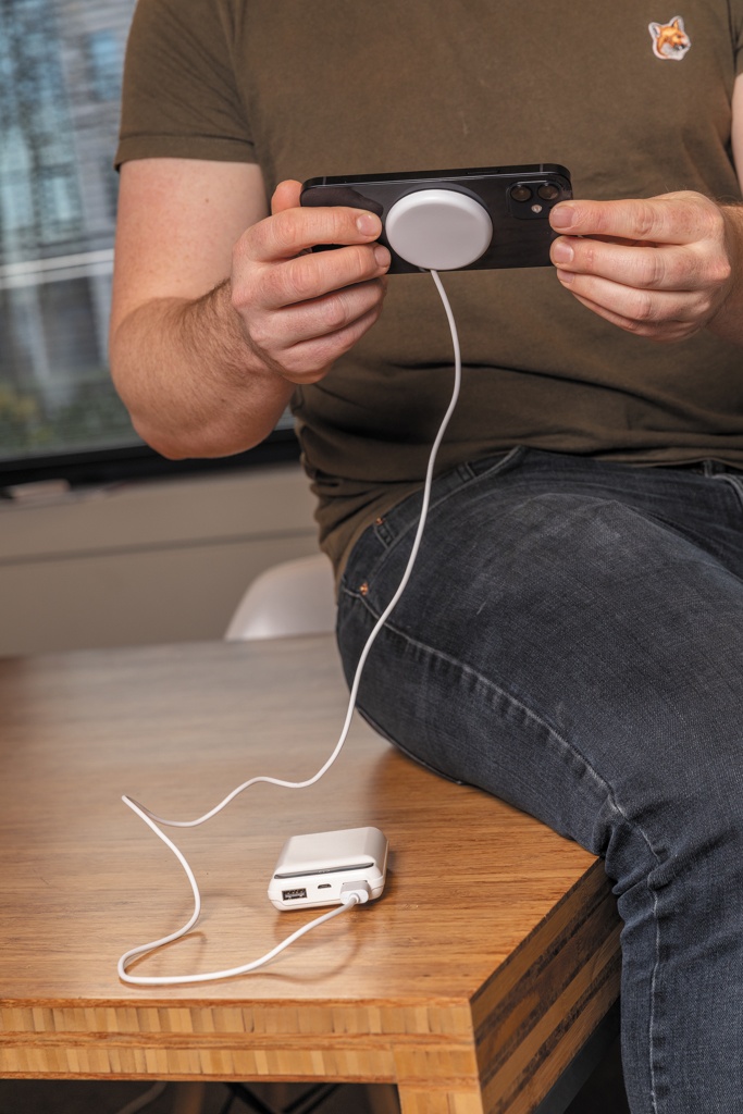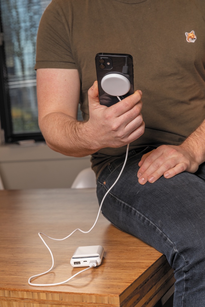Snap on this magnetic wireless charger to the back of your iPhone 12 to charge your device. The magnets are perfectly aligned to always ensure the right charging position on your phone. The ABS material wireless charger is compatible with all QI devices (Iphone 8 and up and Android devices) so on other phones it can be used as a regular wireless charger. Including 100 cm TPE material micro USB cable. Item and accessories PVC free. Input DC 5V/1.5A; Output 5V/1.0A (5W) 11 pcs high quality N52H heat resistant magnets integrated.