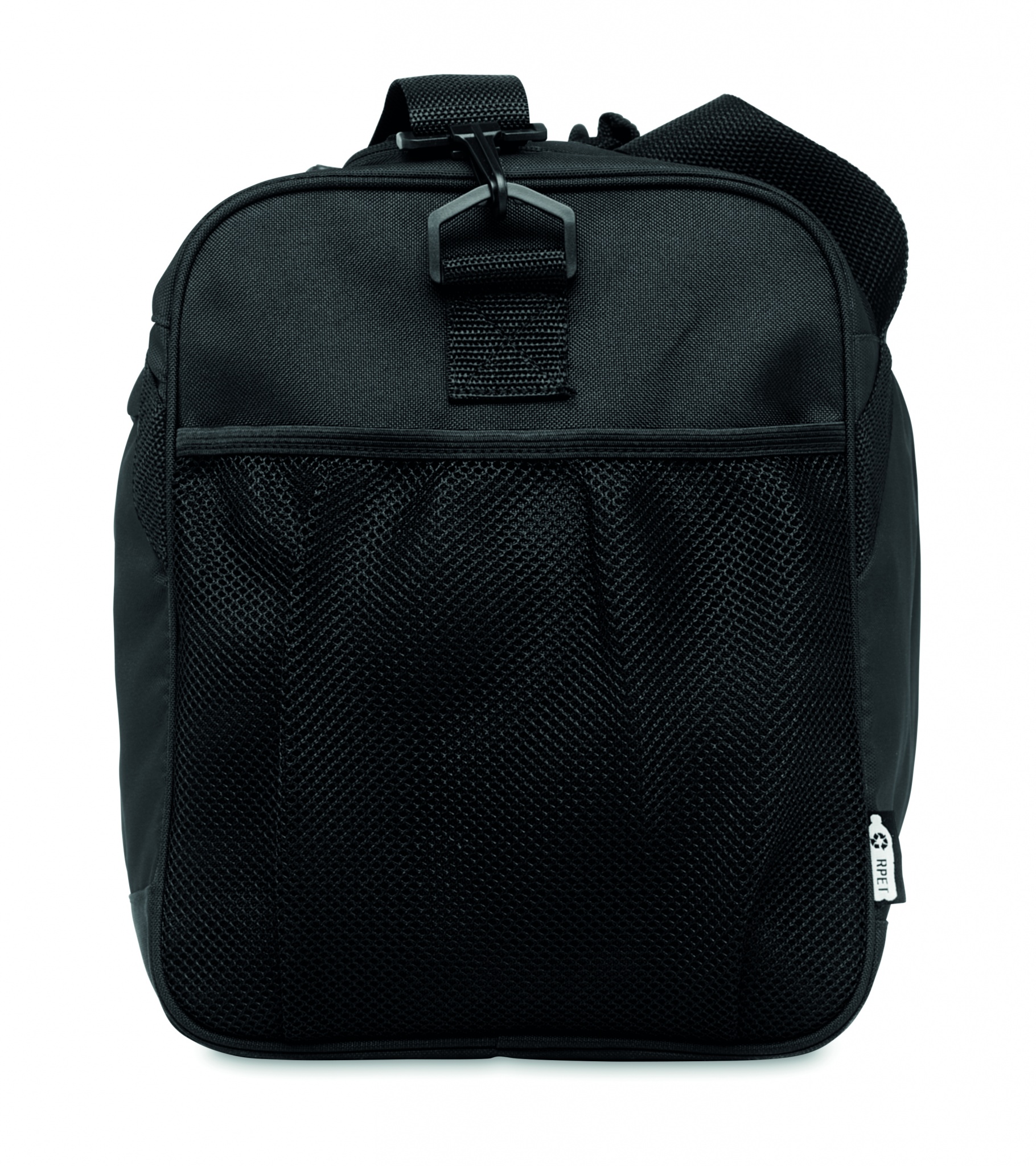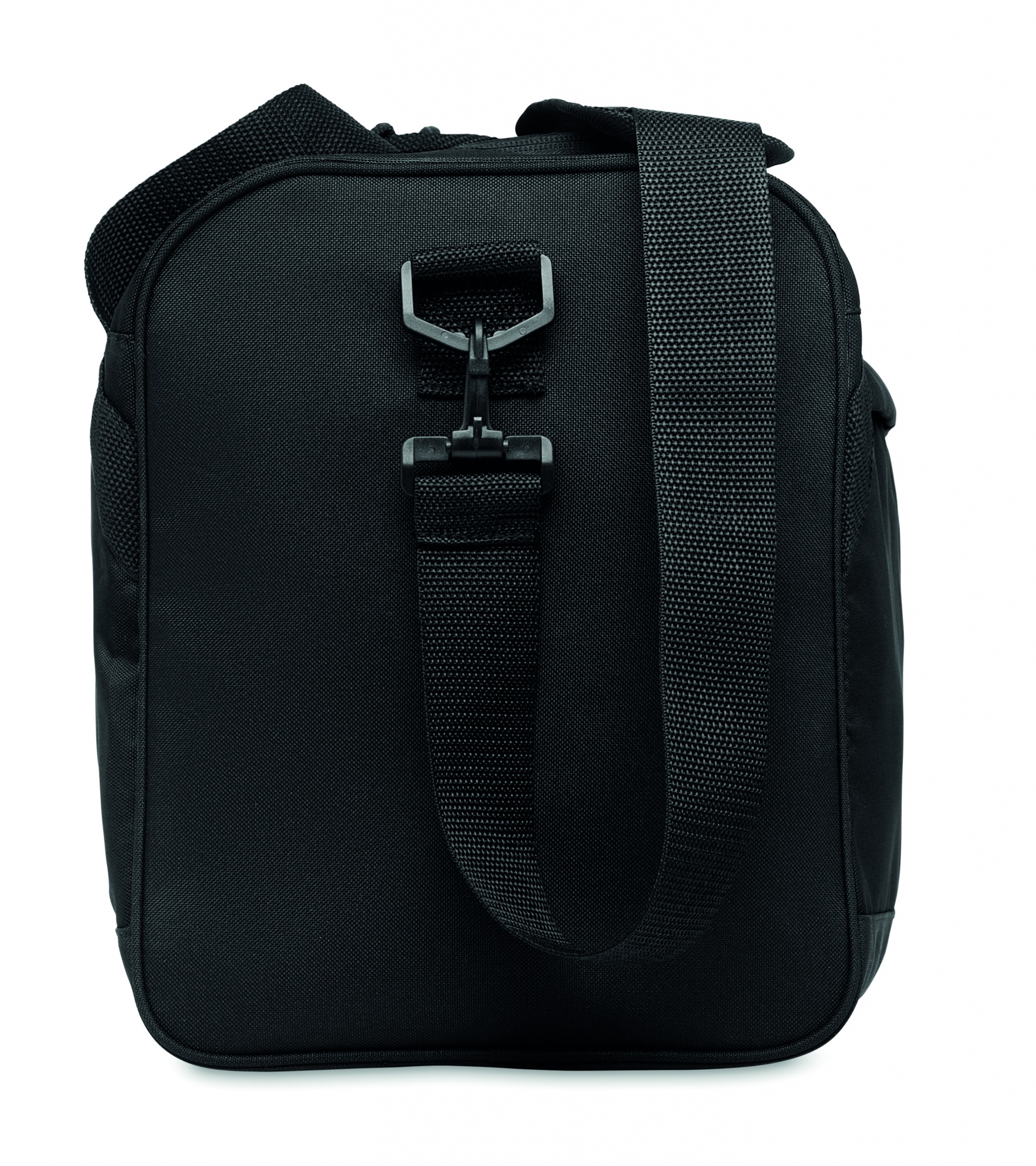 Sport or travelling bag in 600D RPET with large zippered front pocket, inside zippered pocket and adjustable and detachable shoulder strap.