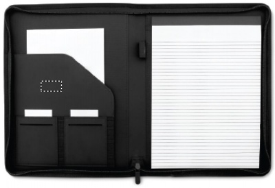 A4 conference folder in two-toned polyester. Zipped. 20 lined pages notepad. 3 compartments. Pen holder.