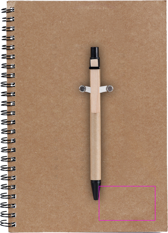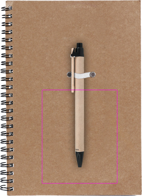 A5 writing pad made of recycled cardboard and paper with 120 lined pages and a blue ink ballpen made of recycled cardboard. We print your logo on the cover.