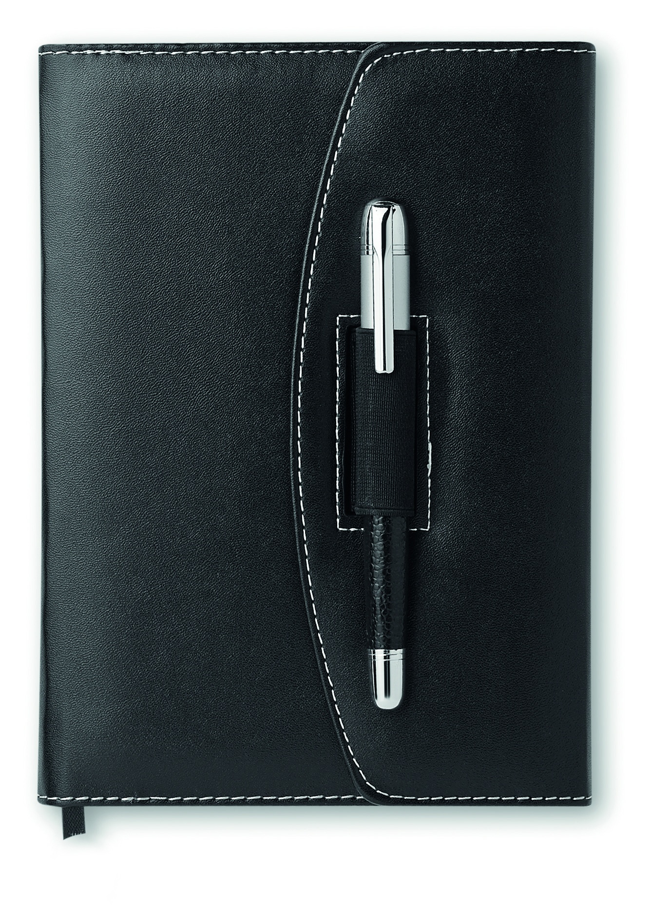 A5 PU notebook portfolio with contrast stiching and pen. 240 lined pages (120 sheets). Matching metal pen. Black ink.