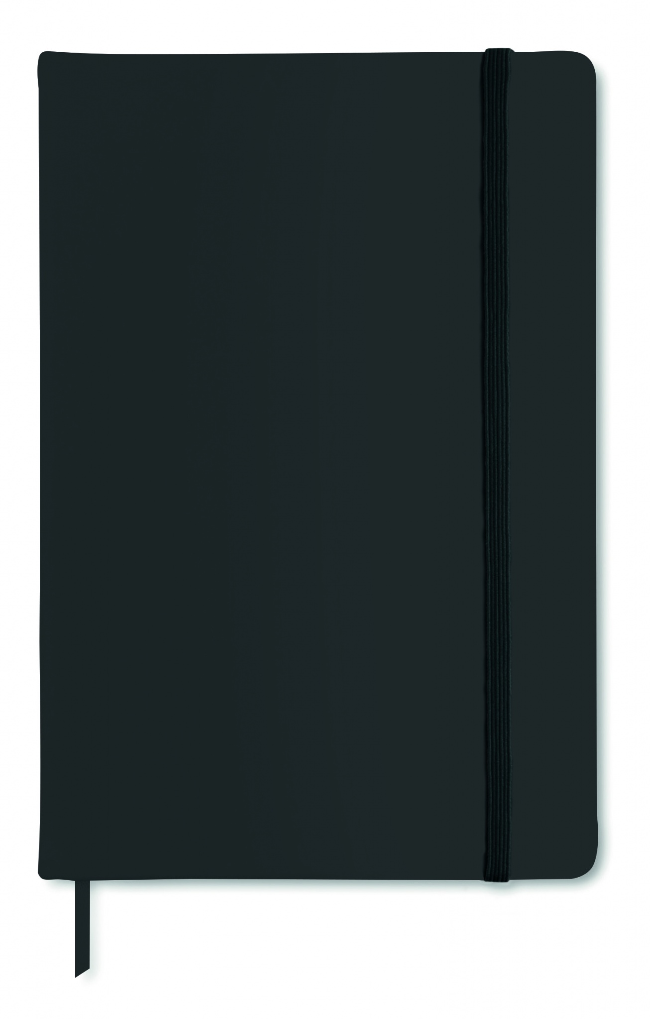 A6 notebook with hard PU cover. Casebound. 192 lined pages (96 sheets). Matching elastic closure strap and ribbon page-marker.