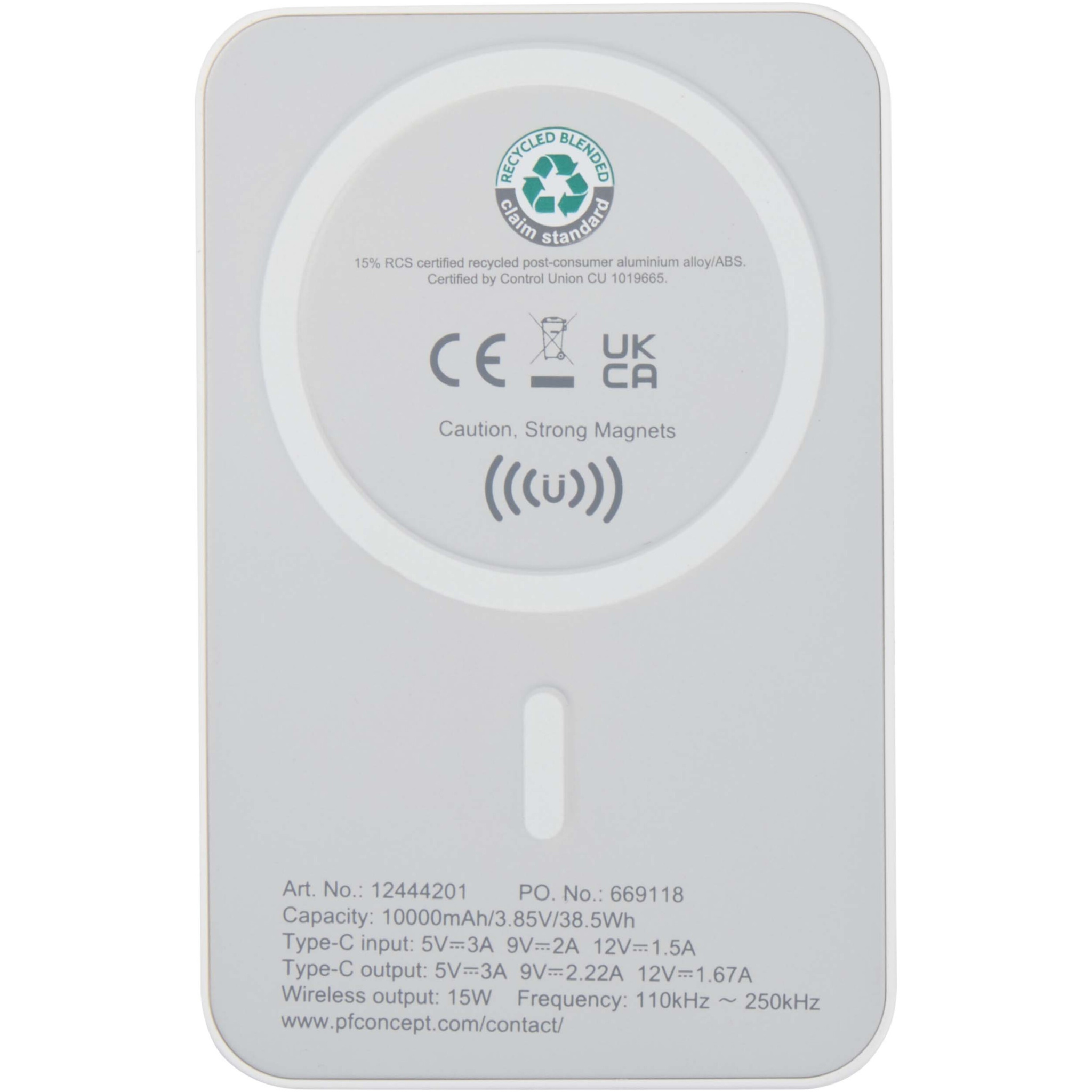Charge smarter and faster with the compact Acrab 10.000 mAh power bank, made from recycled plastic. Enjoy up to 15W magnetic wireless charging for compatible smartphones, including iPhone 12 and newer. For other wireless charging-enabled devices without magnetic function, a metal ring sticker is included for secure alignment. The power bank also supports 20W wired Type-C fast charging, and the ability to charge two devices at once (wireless and wired), making it perfect for staying powered up on the go. A LED indicator keeps you updated on the charging/battery status.