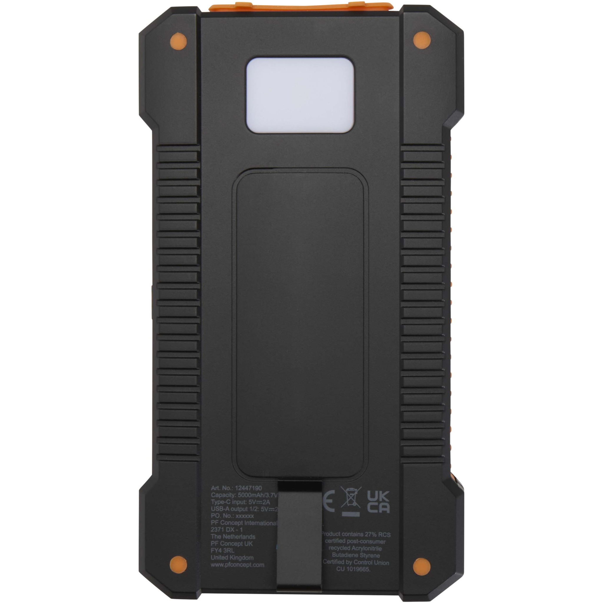 Logotrade promotional product picture of: Altair 5000 mAh 10W recycled plastic rugged solar power bank with built-in torch