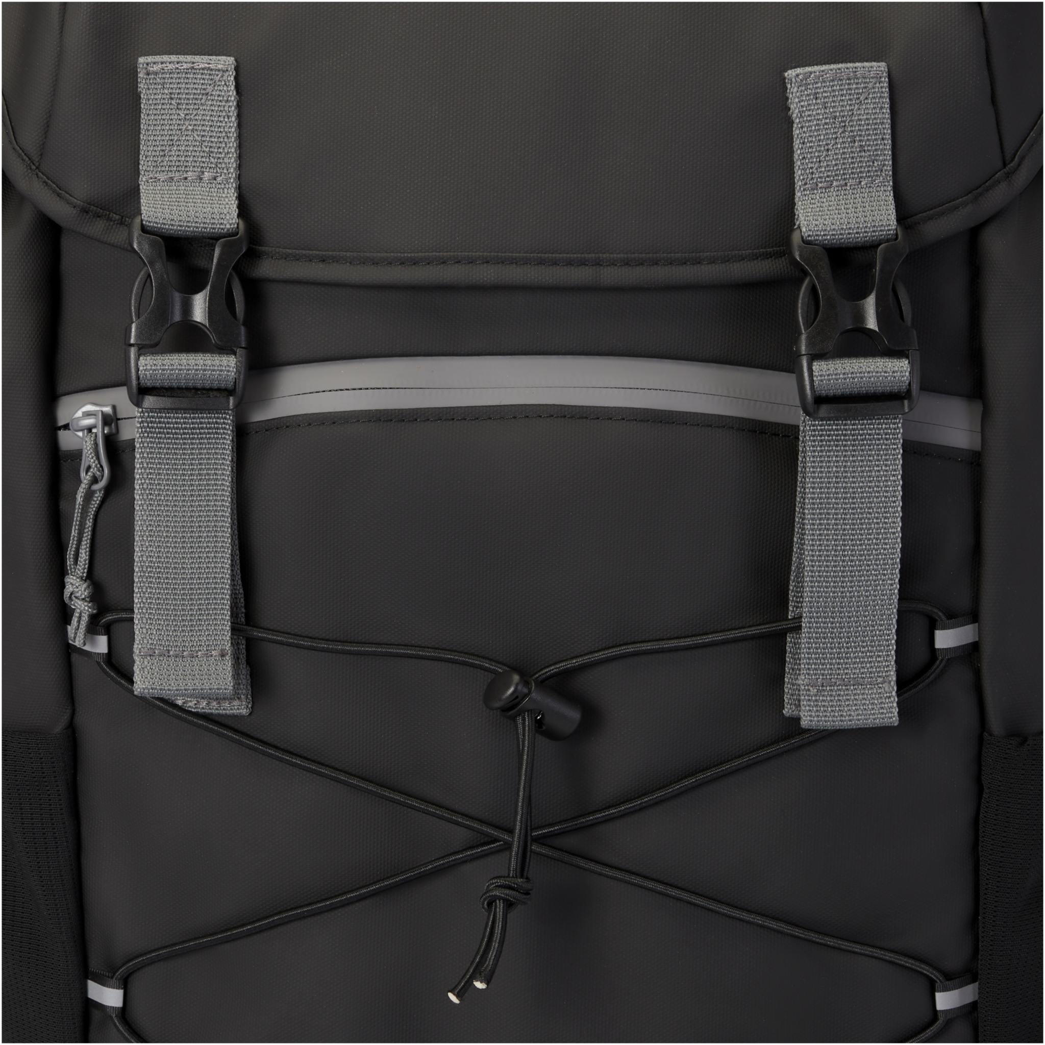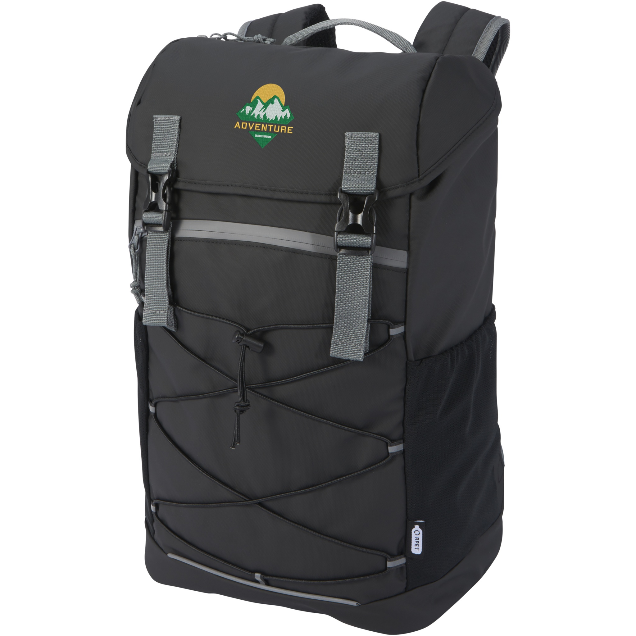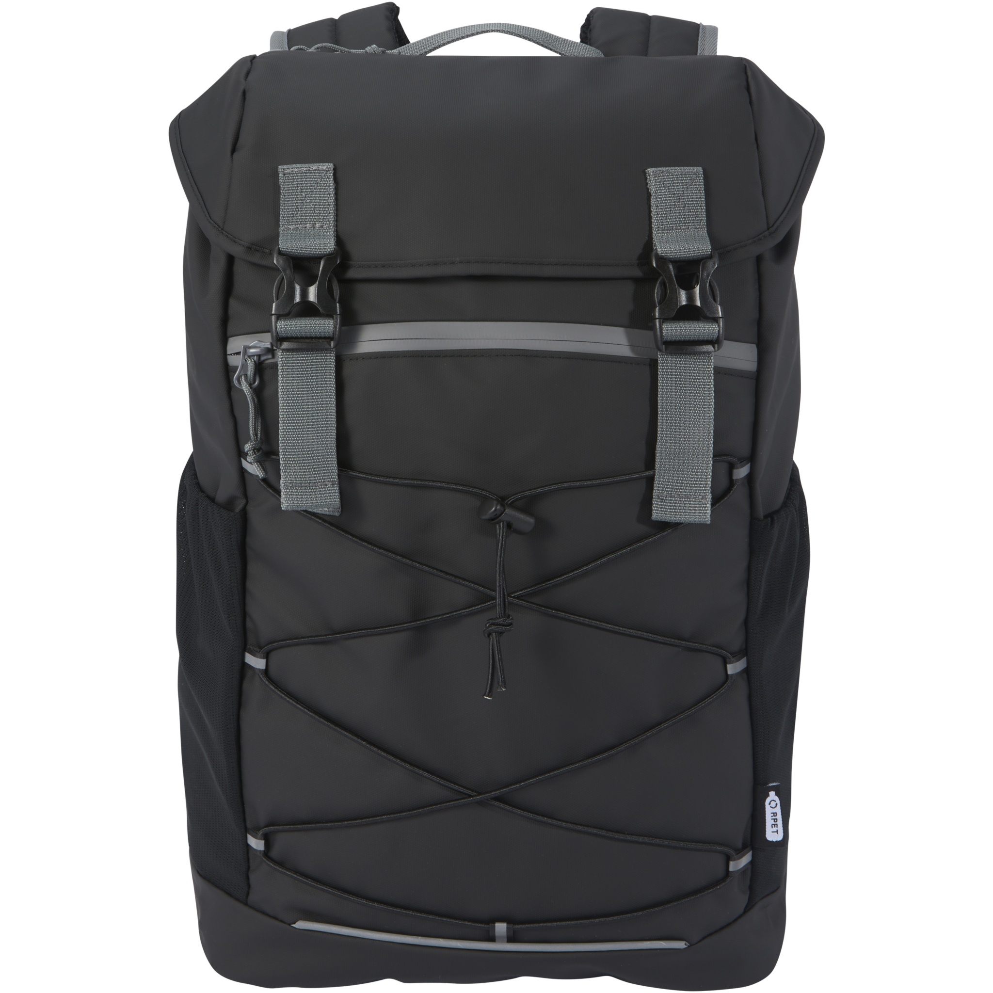 Water-resistant laptop backpack made from GRS certified recycled materials, including the zips. It features a spacious 15.6” laptop compartment with a drawstring cord and ajustable buckles to maximize storage room under the flap cover. This backpack has multiple pockets, including a zippered front pocket with elastic drawstrings for storing and organising, and reflective piping for visibility. The moulded and padded backing and adjustable chest strap makes it comfortable to carry around even when fully loaded. The GRS recycled materials include the main fabric, lining, webbing, and zips. Capacity: 23 litres. PVC free.