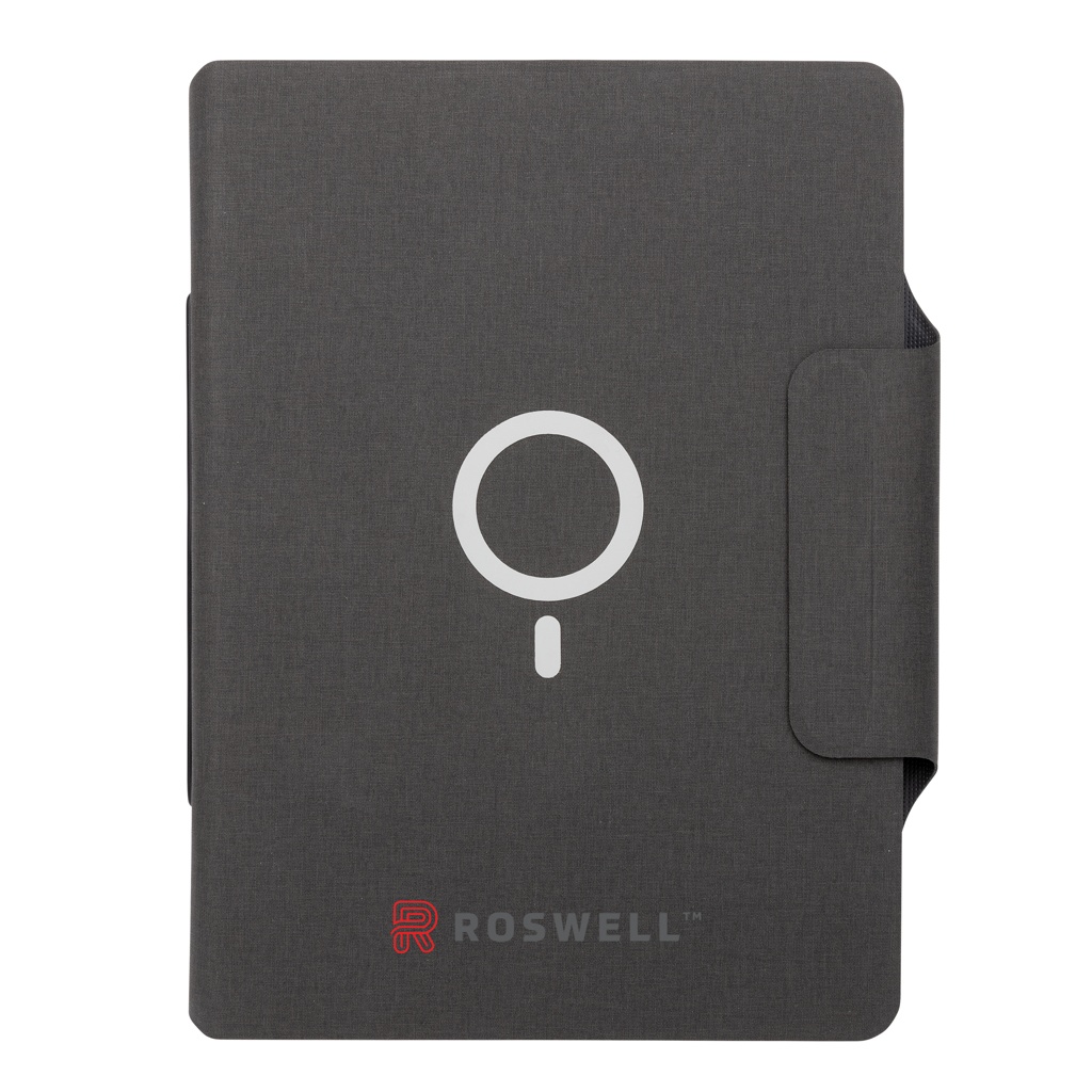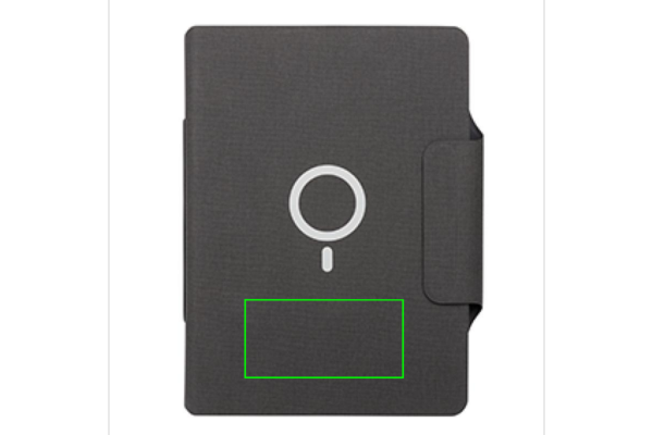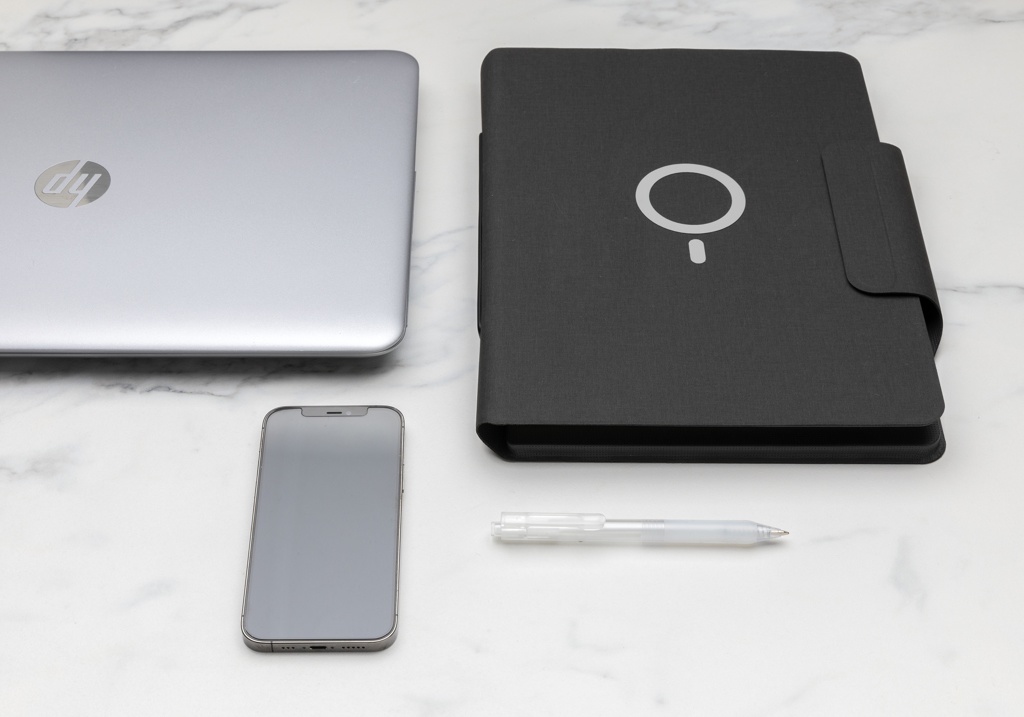 Charge your mobile device wirelessly at full speed with this A4 PU material notebook portfolio with integrated magnetic 10W wireless charger and 8000 mah powerbank. Snap your phone (iPhone 12 or higher) to the wireless charger and the phone will align perfectly with the magnets inside. The 10W wireless charger is compatible with all QI devices (Iphone 8 and up and Android devices) Type-C input 9V/2A; Wireless Output 9V/1.1A; Type-C output 9V/2A. The notebook includes 20 sheets/40 pages of 80 gsm lined paper. With phone/tablet pocket and pen loop. 19 pcs high quality N52H heat resistant magnets integrated. Registered design.