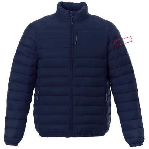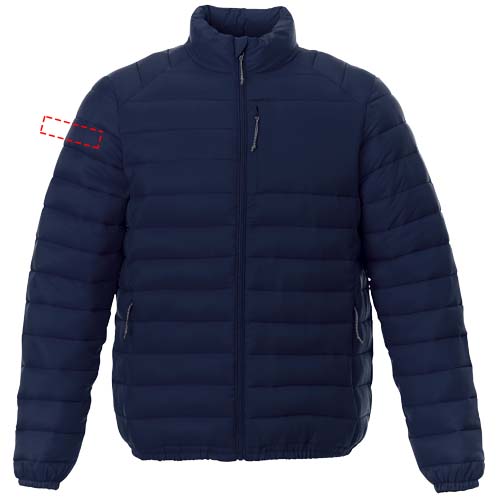 The Athenas men's recycled insulated jacket – a perfect blend of style and functionality. Stay protected from cold and wind with the inner stormflap featuring a chinguard. The jacket's chest pocket with zipper closure provides a secure space for your essentials. The elasticated binding adds a stylish touch while ensuring a secure fit. Made of 38 g/m² of dull cire 380T nylon woven fabric, the jacket offers a sleek and durable exterior. The padding and filling consist of fake down insulation made of polyester, providing lightweight warmth without compromising on comfort.