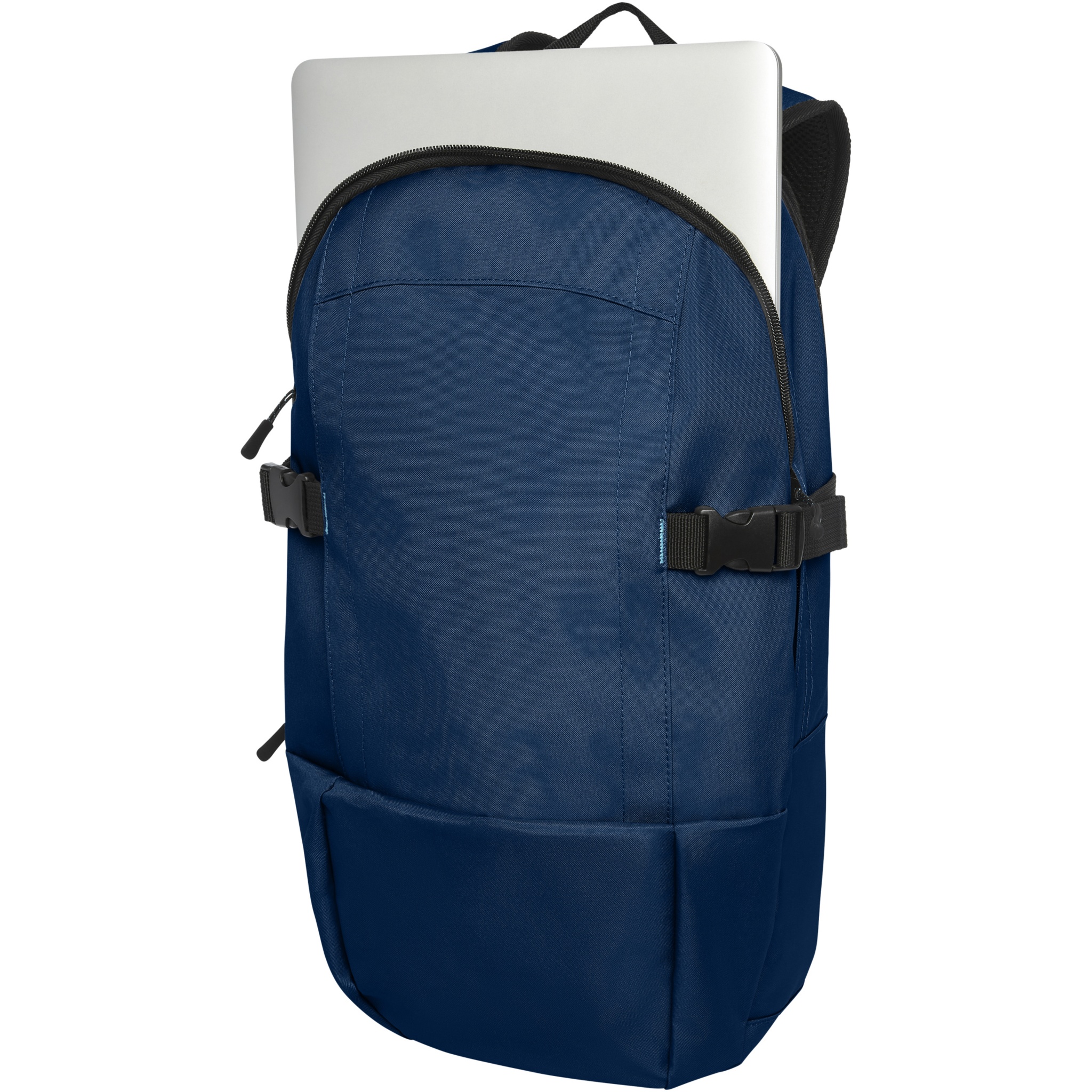 Sustainable GRS certified RPET laptop backpack made with 50% recycled materials. Features a large zippered main compartment with a padded 15" laptop sleeve with velcro closure, a hanging hook, and a front vertical zippered compartment. Comes with additional straps with buckle closure for safety, comfortable padded shoulder straps, grab handle, mesh back with a zippered pocket and expandable mesh side pocket.