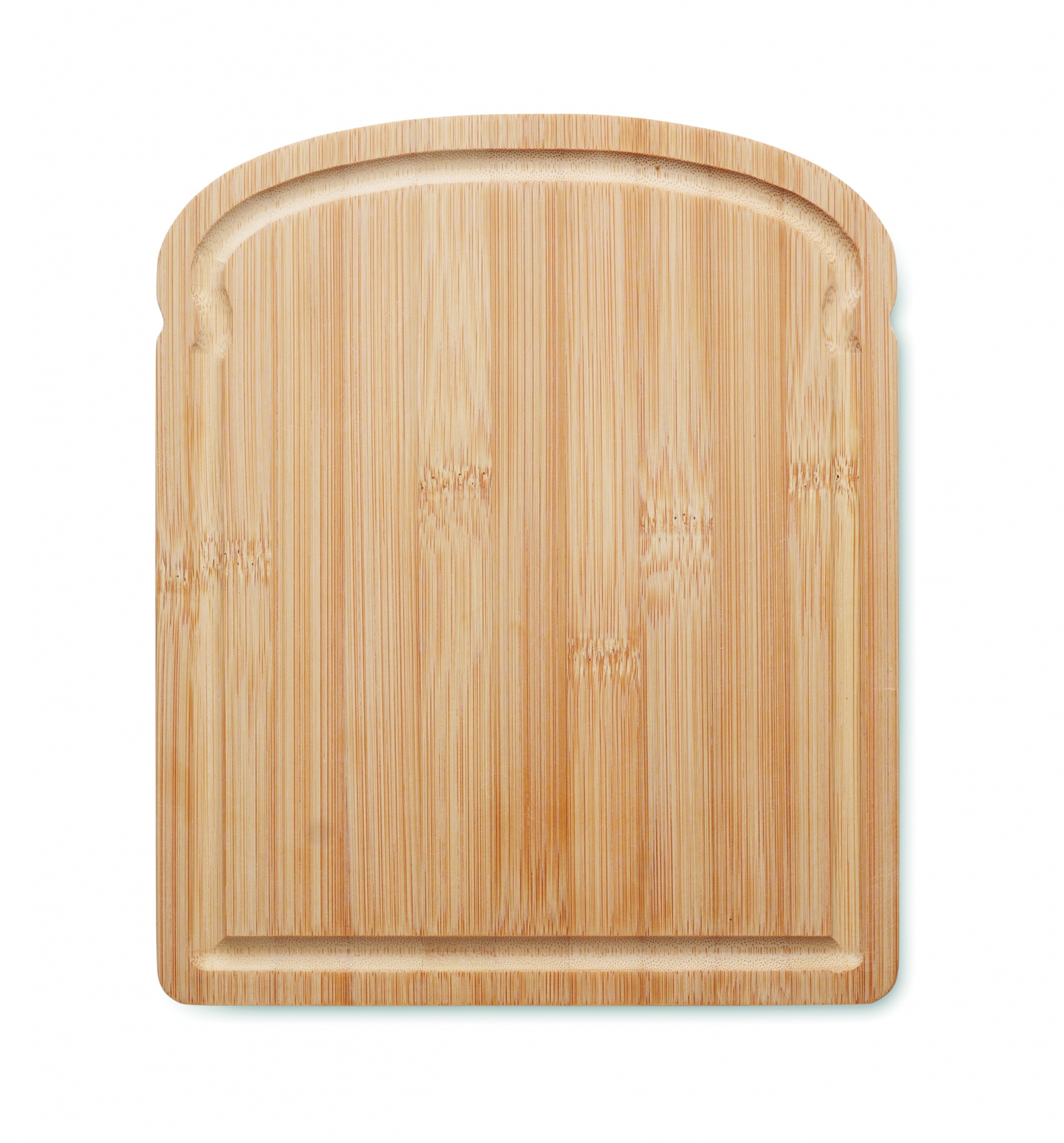 Bread-shaped cutting board in bamboo with groove around the edge.