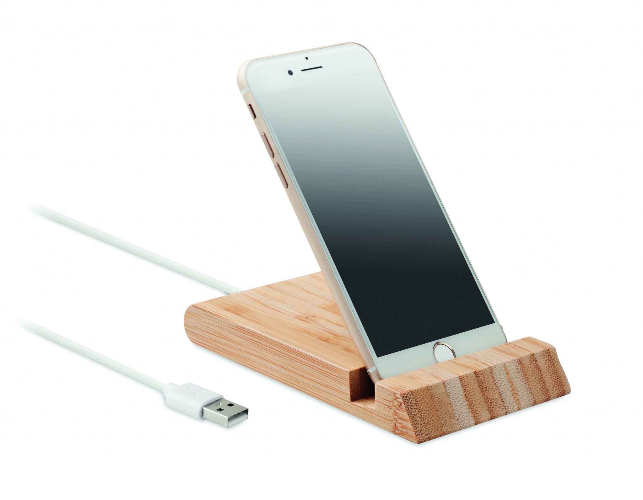 10W Bamboo wireless charger with stand functionality. Output: DC 9V/1.1A suitable for quick charging. Compatible with latest Androids, iPhone® 8 and newer. Bamboo is a natural product, there may be slight variations in colour and size per item, which can affect the final decoration outcome.