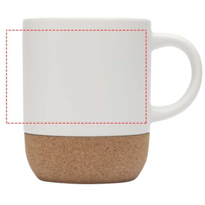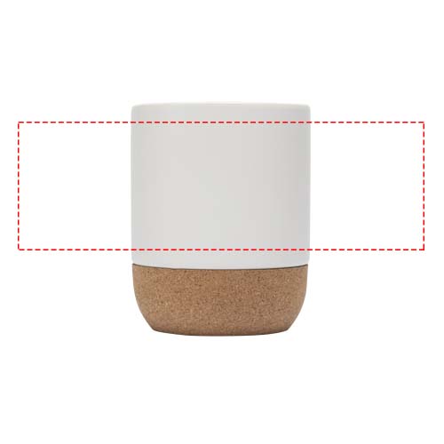 Ceramic mug with cork detail on the bottom, and a special coating on the outside that allows for sublimation printing. Glossy white interior and exterior. Hand wash with warm water and mild detergents. Presented in a recycled cardboard gift box. Volume capacity: 300 ml.