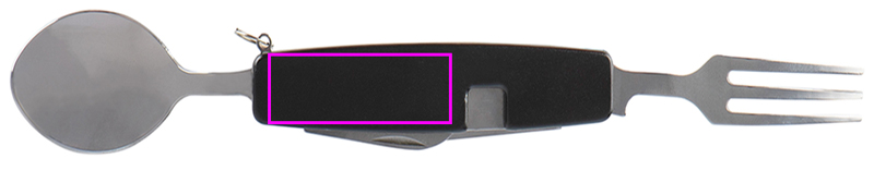 Two-piece camping cutlery made of stainless steel. It can be split in the middle so you get knife and fork, or bottle opener and spoon. We engrave your logo on one side.