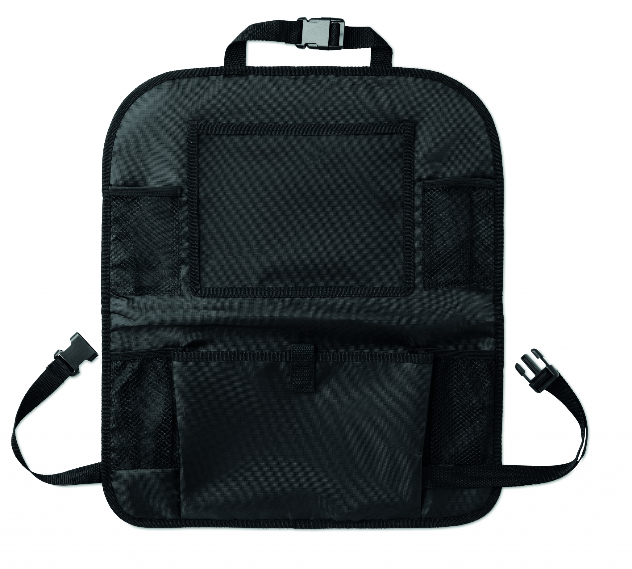 Car organizer for the back of the seat with several compartments in 420D polyester.