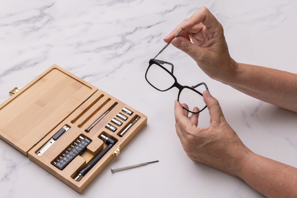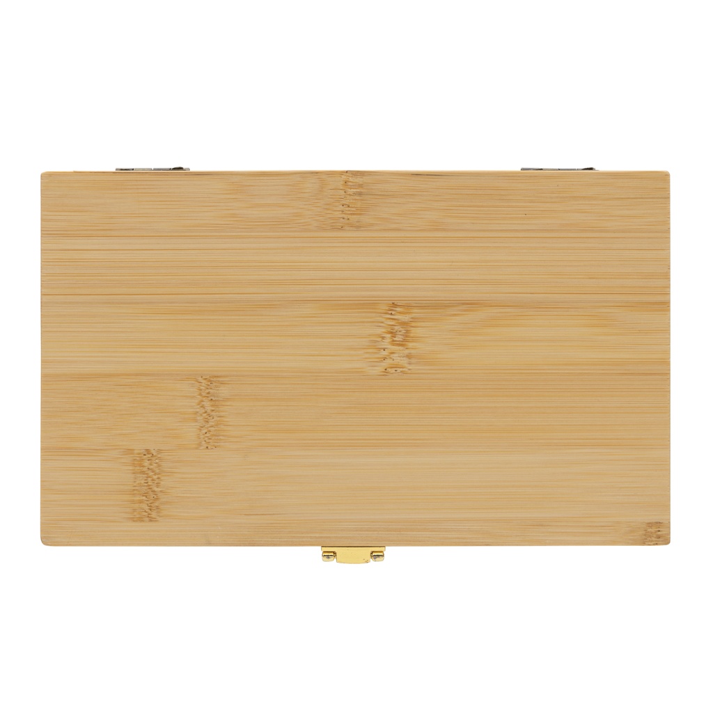 Tool set with 21 pcs in luxury FSC® 100% bamboo case. The set contains 3 screwdrivers, 10 bits in holder, 4 sockets, 1pc handle, 1pc connector, 1pc small cutter. Packed in FSC® mix kraft packaging