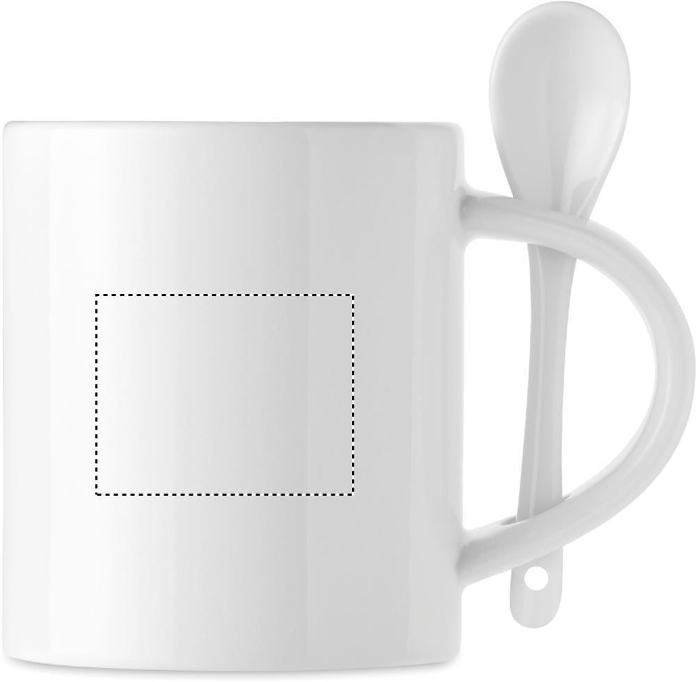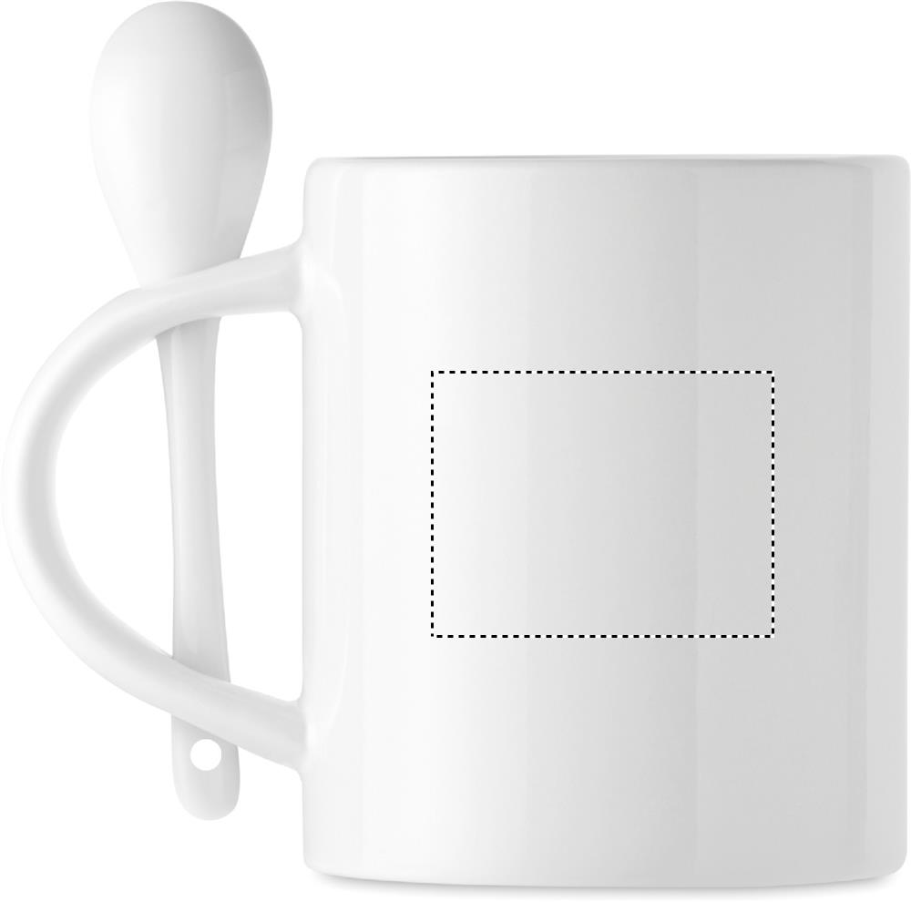 Ceramic mug and spoon with special coating for sublimation print. Spoon is stored in the handle. Capacity: 300 ml.