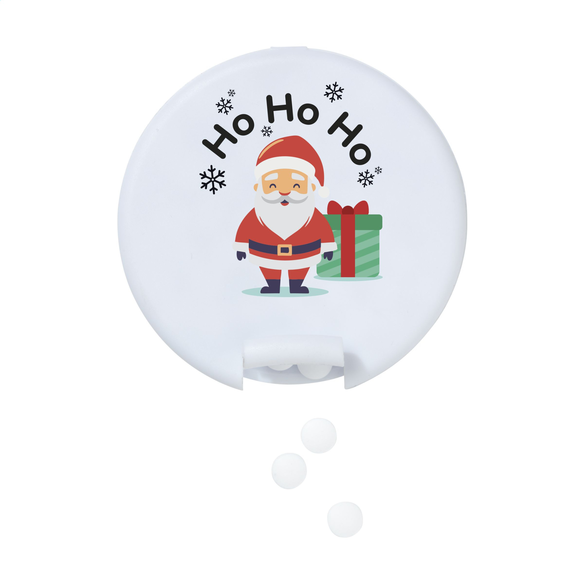Round plastic dispenser filled with approx. 12 g (55 pieces) of sugar free mints. - This product is printed with a standard Christmas design. Choice of 6 different designs as shown in the images. It is not possible to customize a design.