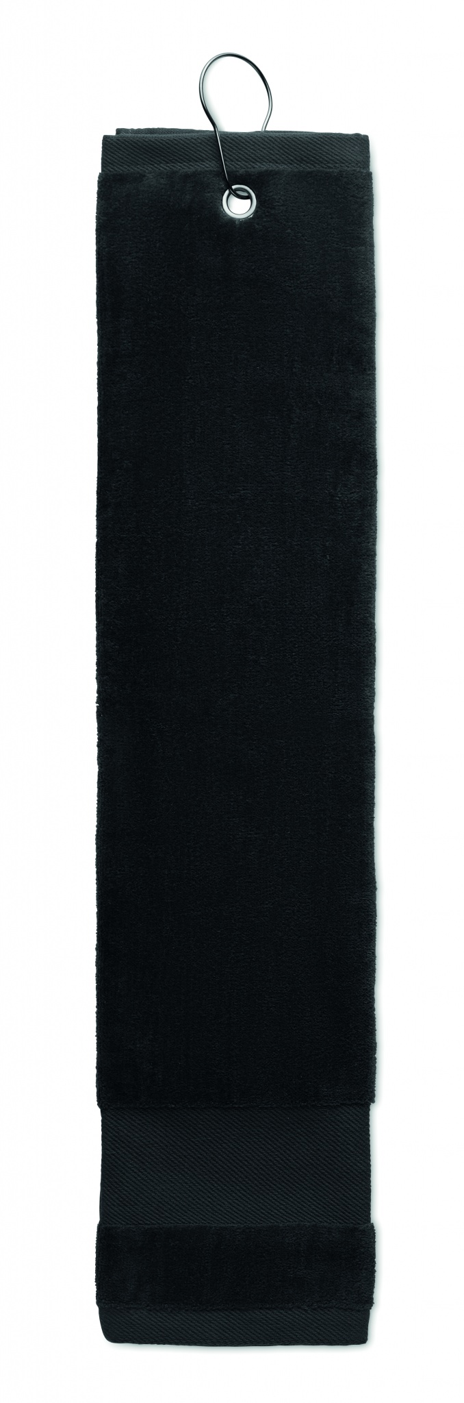Cotton golf towel with a copper hole and ring on top that can be used as a hanger. 350 gr/m². Towel size: 40x60 cm.