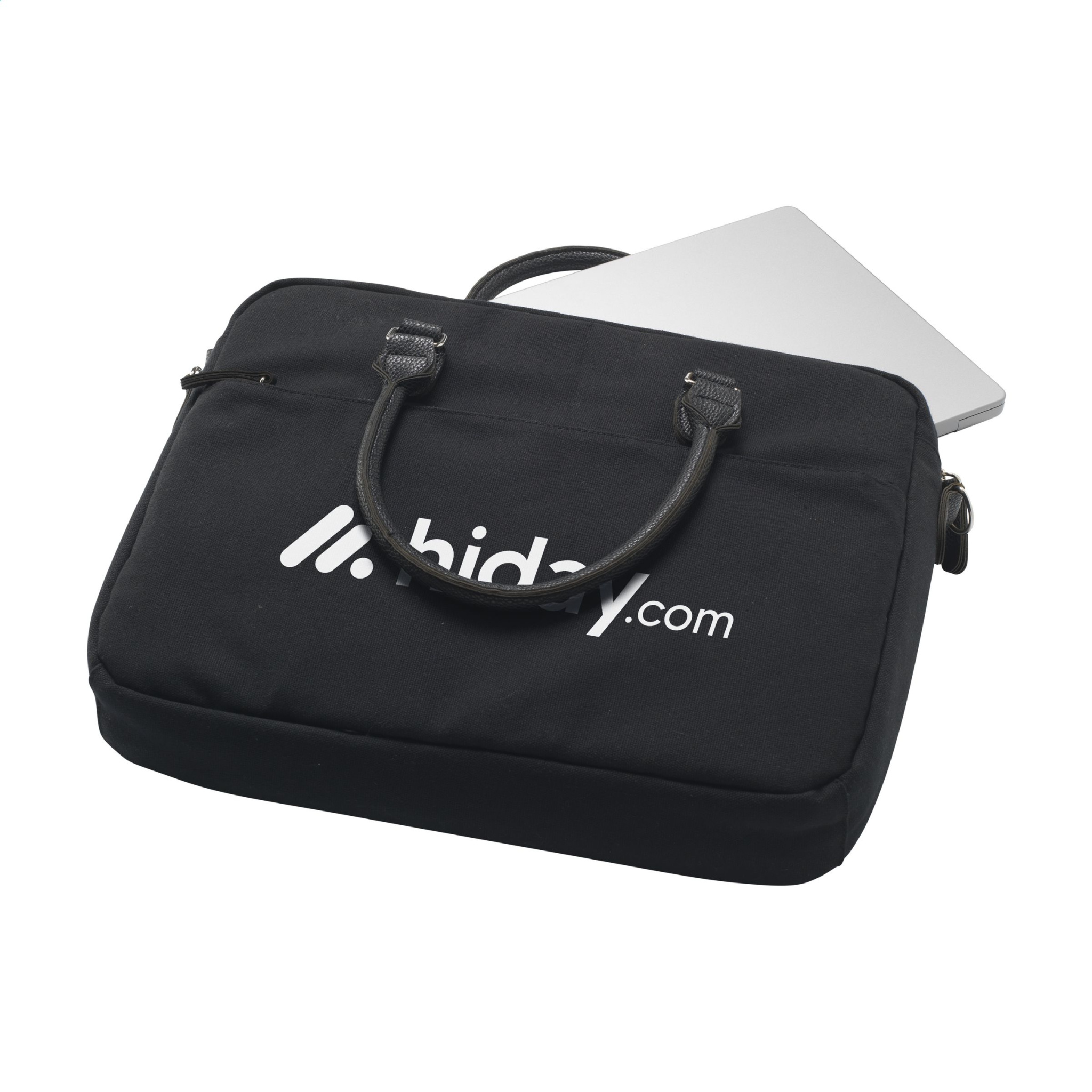 WoW! This practical laptop bag is made from recycled canvas (340 g/m²). Features a spacious storage compartment and a separate section equipped with protective foam for the safe storage and transport of a laptop up to 15.6 inches in size. In addition, there is a lot of smart storage space. This bag is equipped with two sturdy handles made from recycled PU and a detachable/adjustable RPET polyester shoulder strap and is beautifully finished with an RPET polyester lining. The recycled materials guarantee a long life.