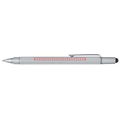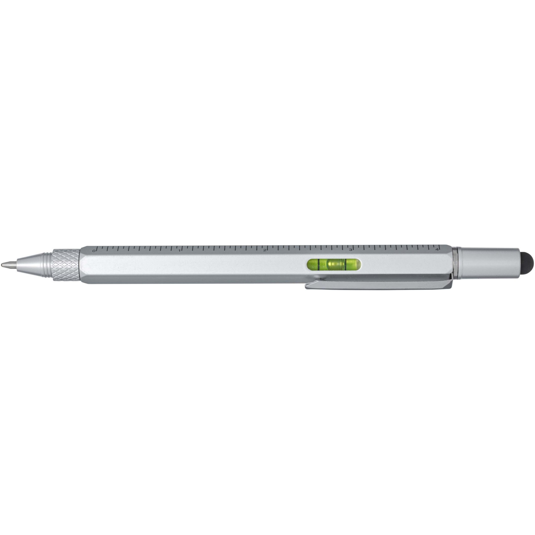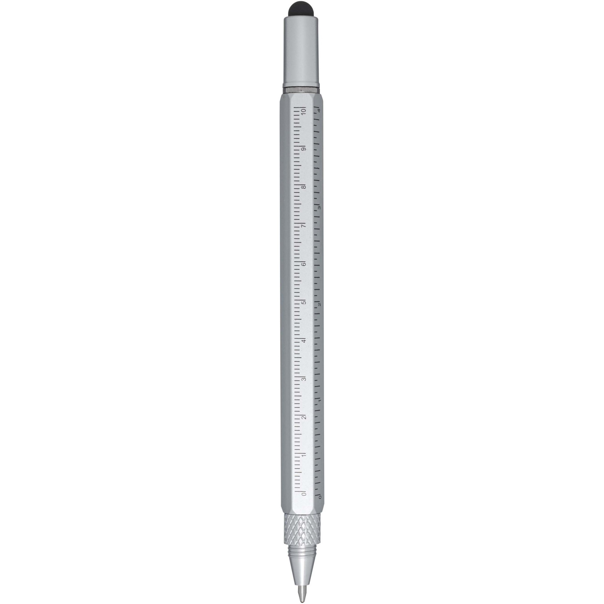 The Dora aluminium multifunctional ballpoint pen is partly made of recycled materials, and features a double sided ruler, lever, screwdriver, gradienter, and a black stylus made of rubber. The barrel is made of recycled aluminium with a silver spray coating. The clip is made of iron. The screwdriver is made of steel. The top part and tip are made of RABS. Ink colour: Black. Writing length: 400 metres. Nib size: 1.0 mm.