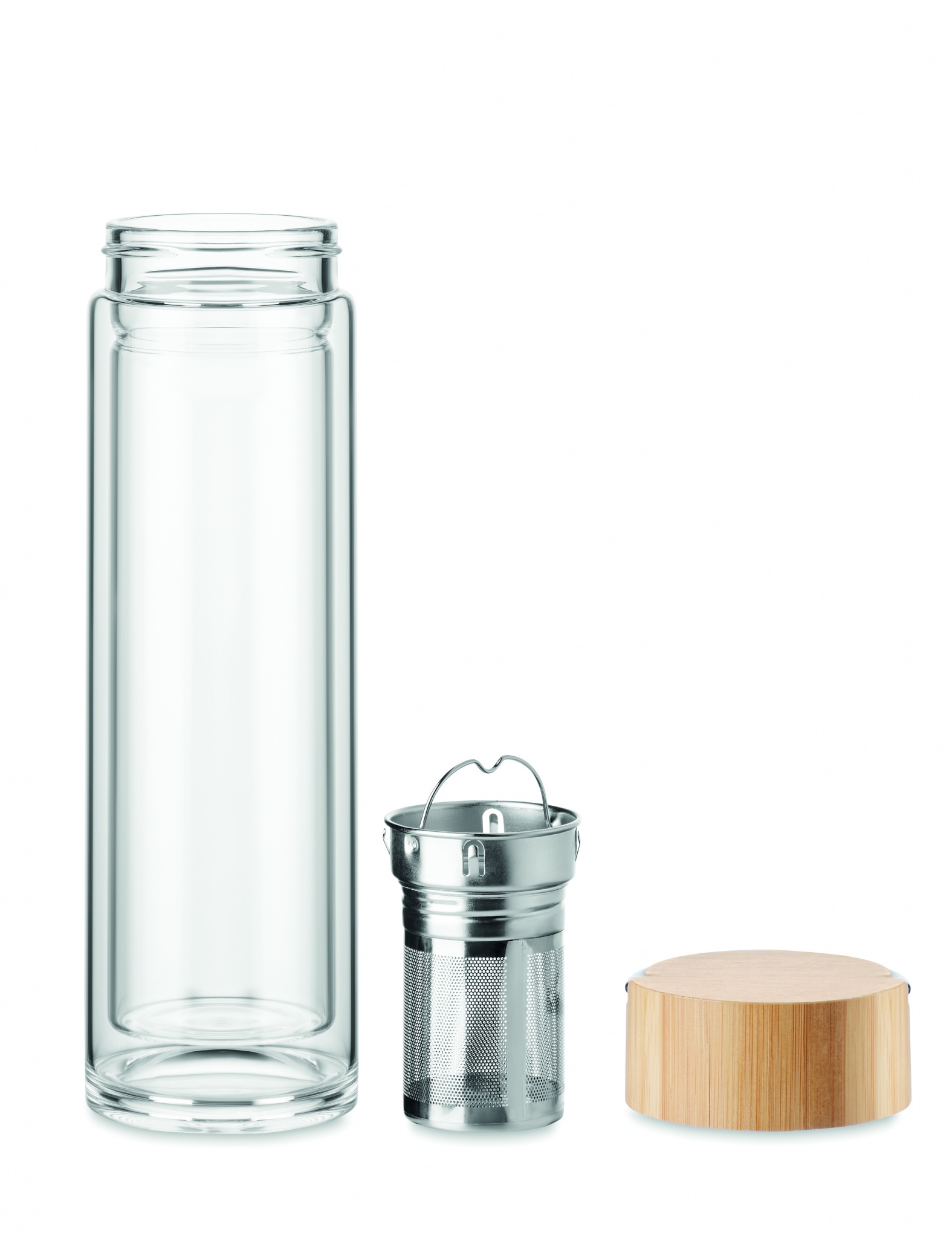 Double wall bottle in high borosilicate glass and bamboo hanger lid with tea infuser. Capacity: 400 ml. Bamboo is a natural product, there may be slight variations in colour and size per item, which can affect the final decoration outcome.