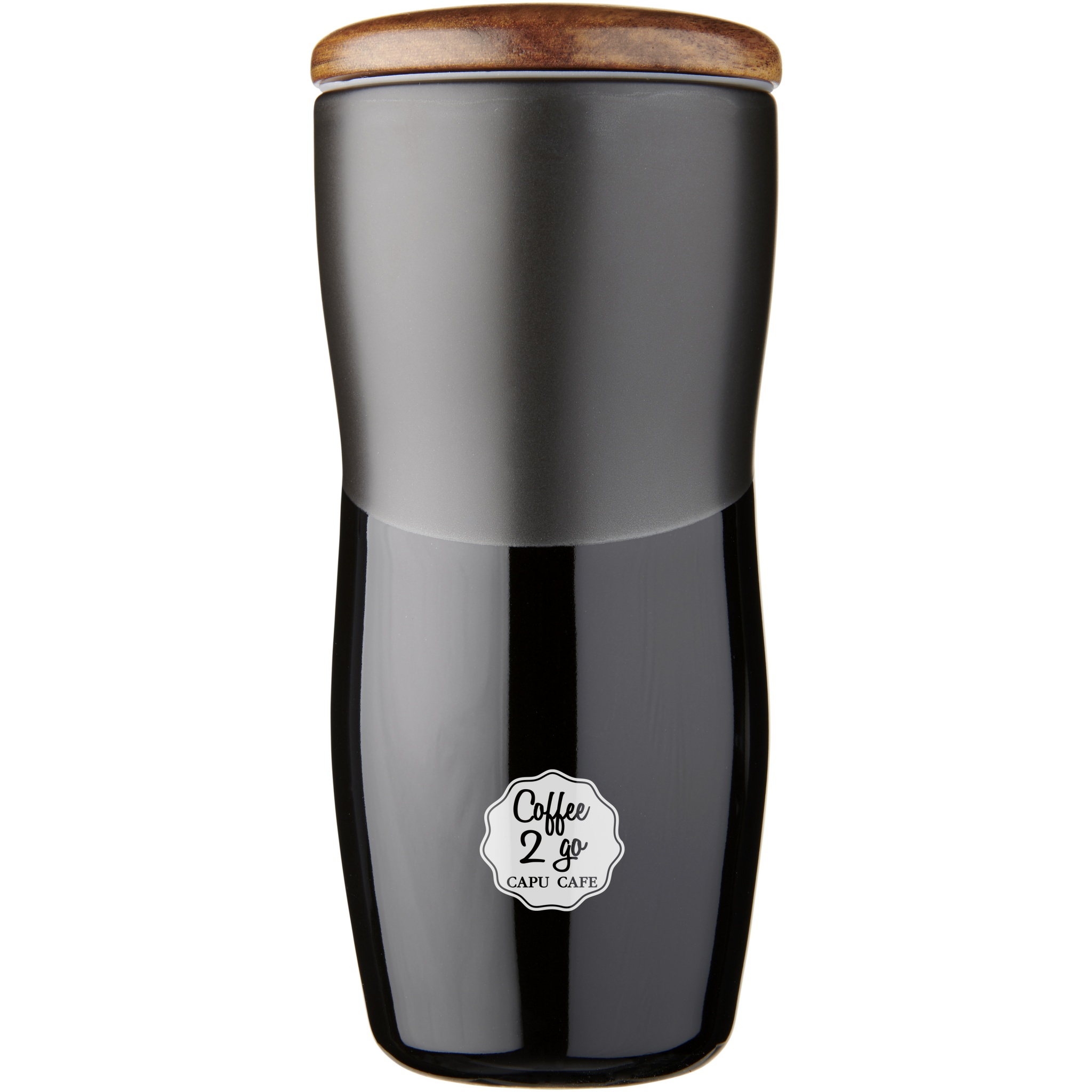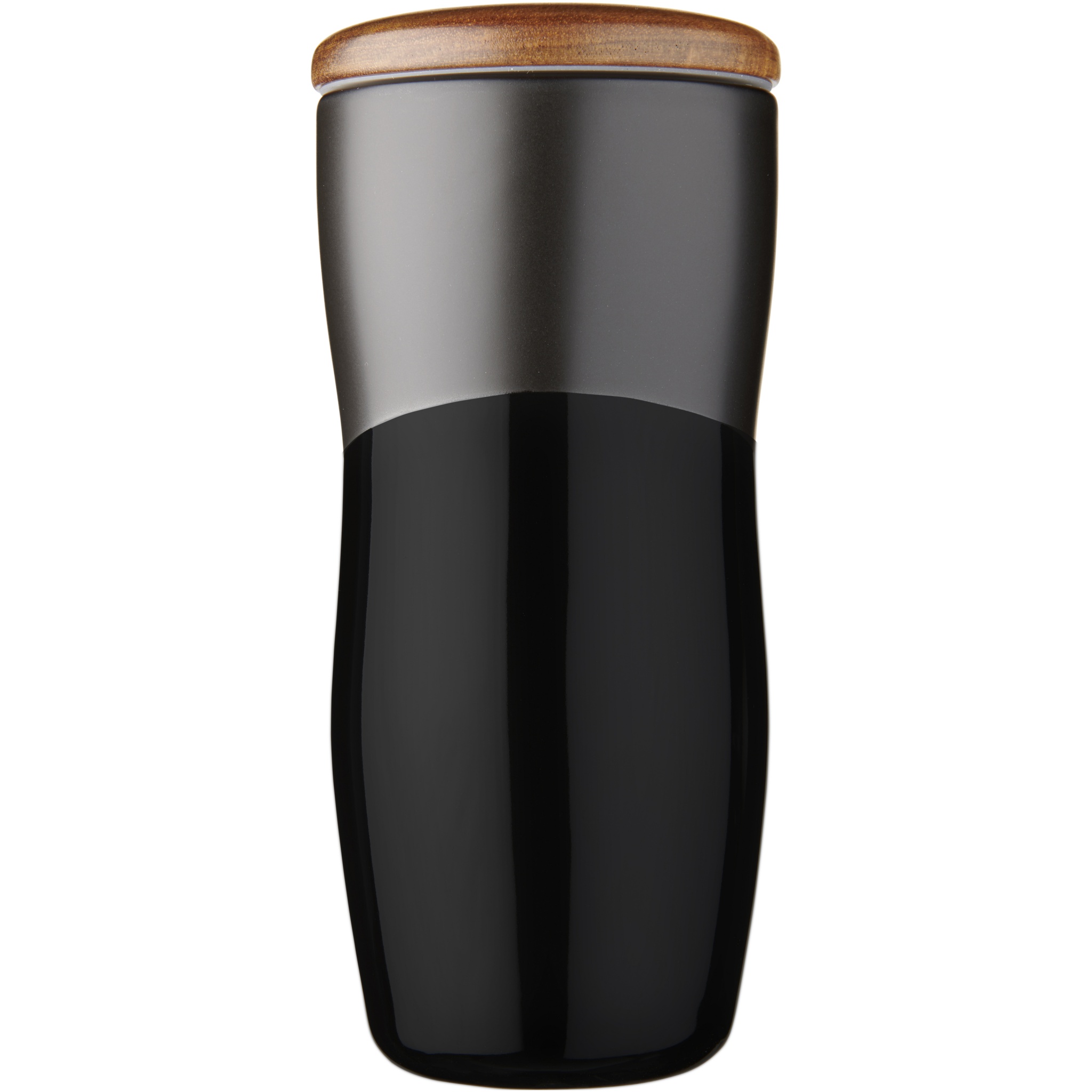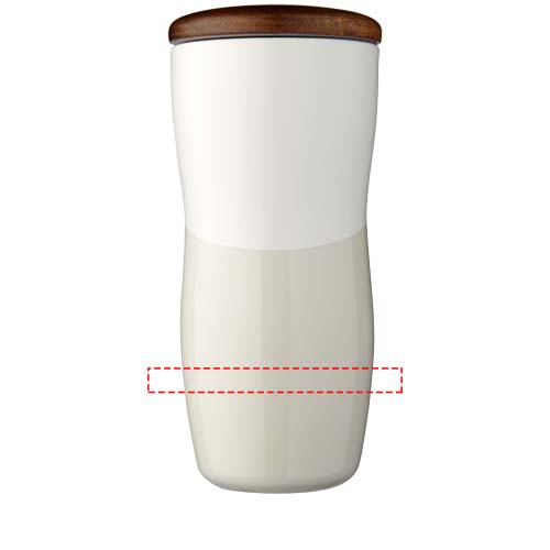 Double-wall ceramic tumbler with matte & shiny contrast design. The double wall ceramic construction also prevents condensation on the outside of the tumbler. Features a push-on wooden lid. Dishwasher safe in accordance with EN12875-1 (at least 125 washing cycles) for all decoration methods. Volume capacity is 370ml. Presented in an Avenue gift box.