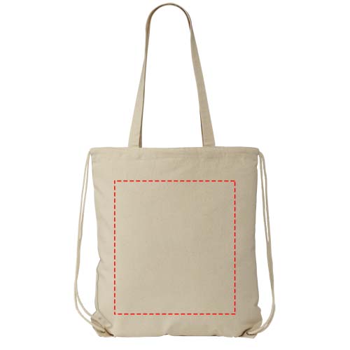 Multi-functional cotton bag with long handles and drawstring which can be carried as tote or backpack. Large main compartment with drawstring closure. Features two dropdown handles length of 31 cm. Capacity: 1.5 L, resistance up to 5 kg weight.