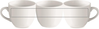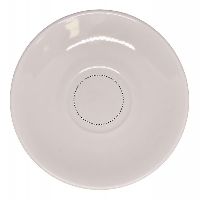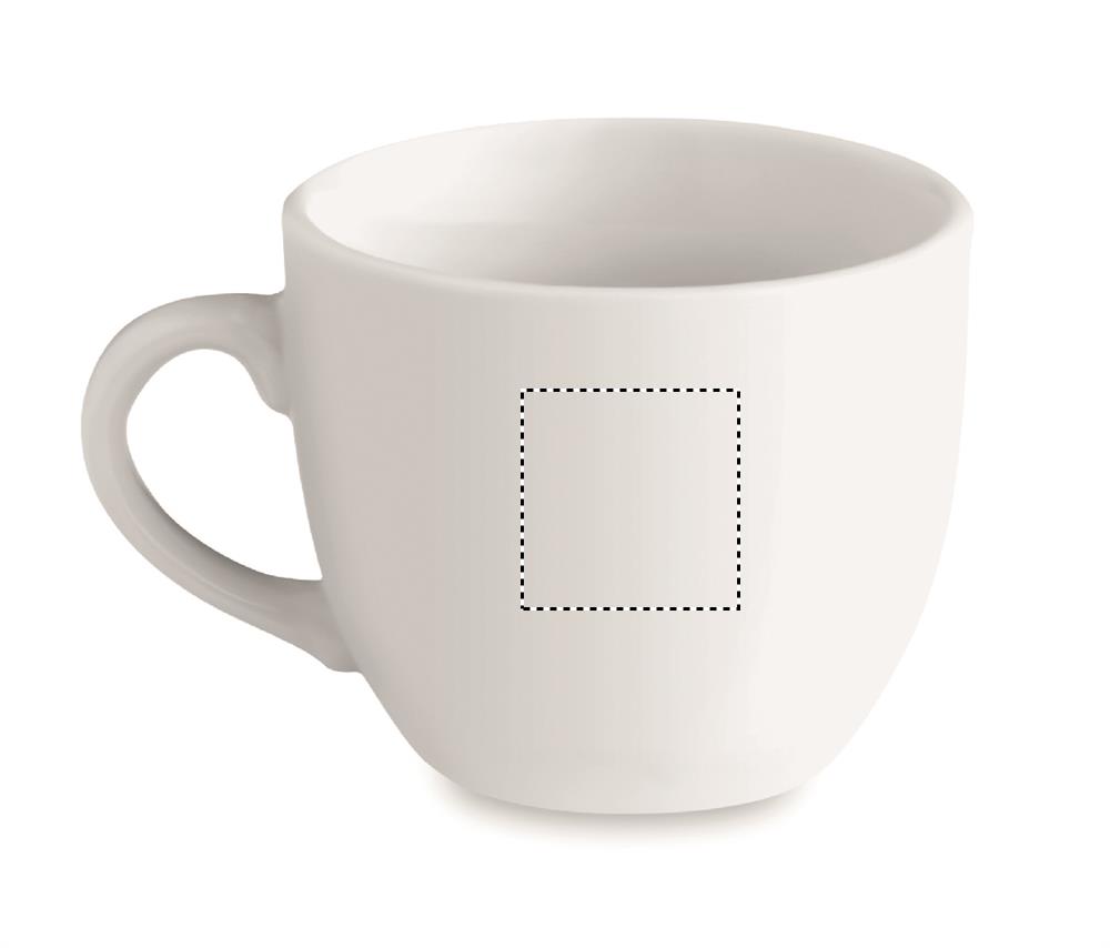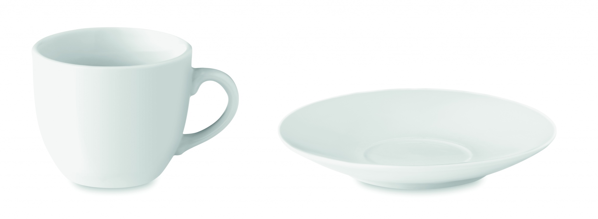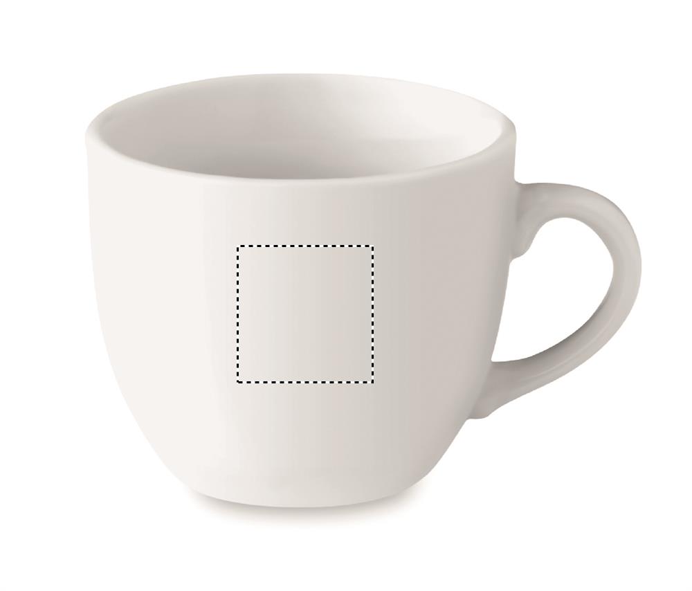 Porcelain espresso cup and saucer. Cup capacity: 80 ml. Bulk packaging. Pad printing is not dishwasher safe. Ceramic transfer is dishwasher safe.