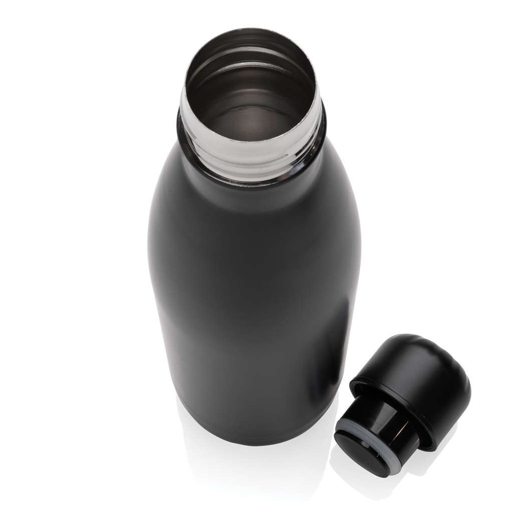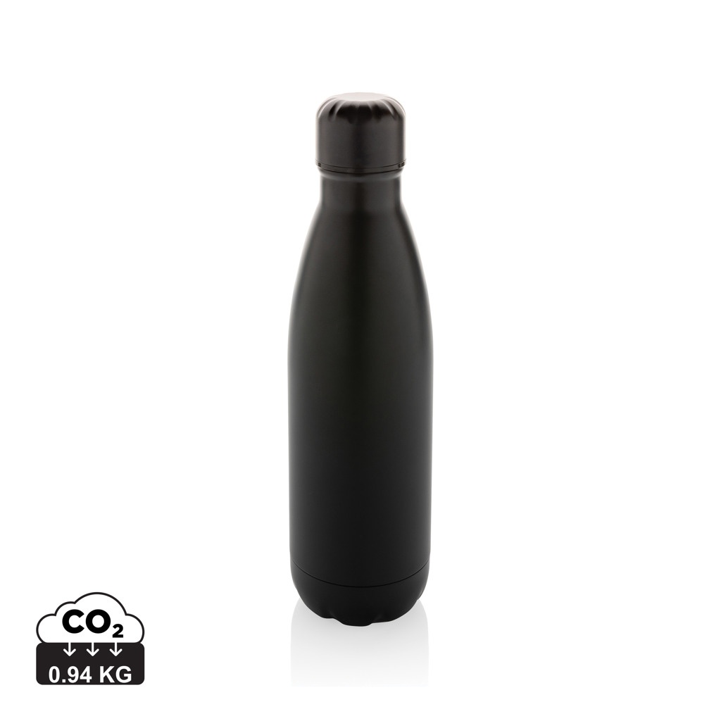 Elevate your daily water intake with this single wall stainless steel bottle. The bottle is suitable for cold drinks only. With a base that fits in most cup holders, this sleek looking water bottle will keep you hydrated on the go wherever you are. Made with RCS (Recycled Claim Standard) certified recycled materials. RCS certification ensures a completely certified supply chain of the recycled materials. Total recycled content: 84% based on total item weight. BPA free. Capacity 500ml. Including FSC®-certified kraft packaging.