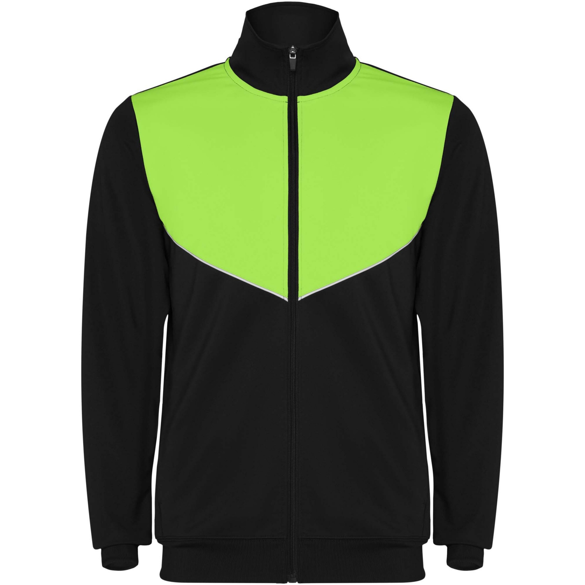Tracksuit in lightweight and elastic fabric. Jacket with contrasting colour and sewing trims on the chest. High collar with contrasting seams. Center front zip. Side pockets. 2x2 ribbed cuffs and waist. Trousers with elastic waistband and drawstring. Contrasting side piece with sewing trim. Zipped hem.