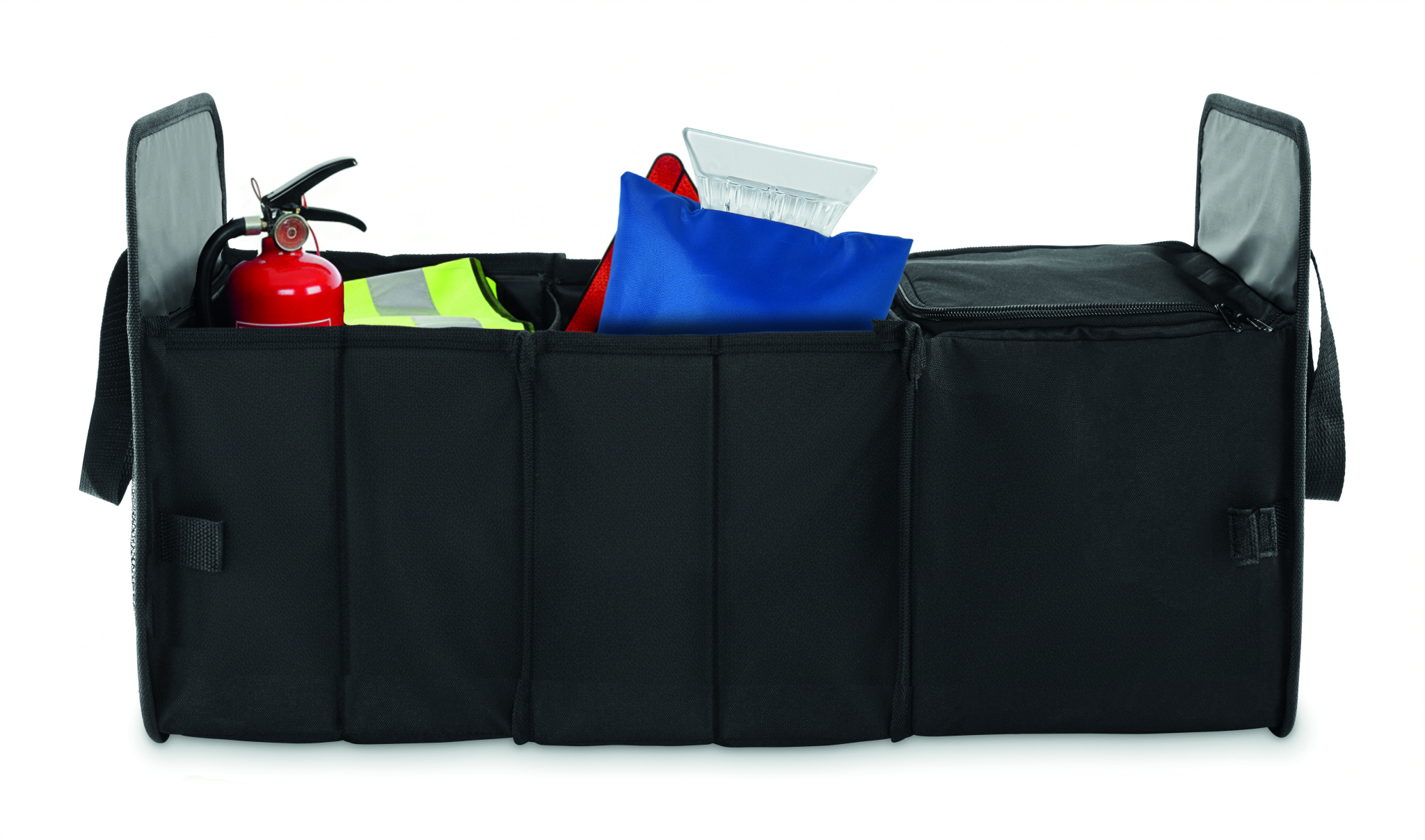 Foldable car organizer in 600D RPET polyester with 3 compartments of which one cooler compartment.