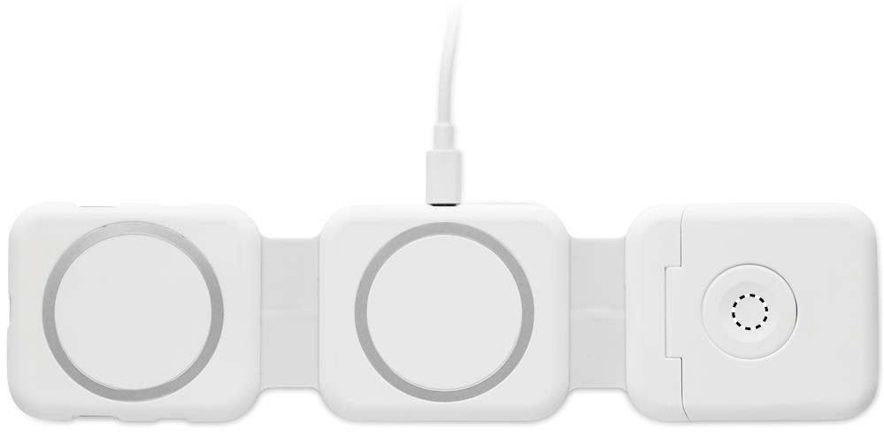 Magnetic charging station in ABS. 3 wireless charging spots. 1 x 15W, 1 x 5W for TWS and 1 Apple Watch charger (3W). 2 Type-C & 2 USB-A HUBS. Integrated cable input: connector from Type-C to USB-A.