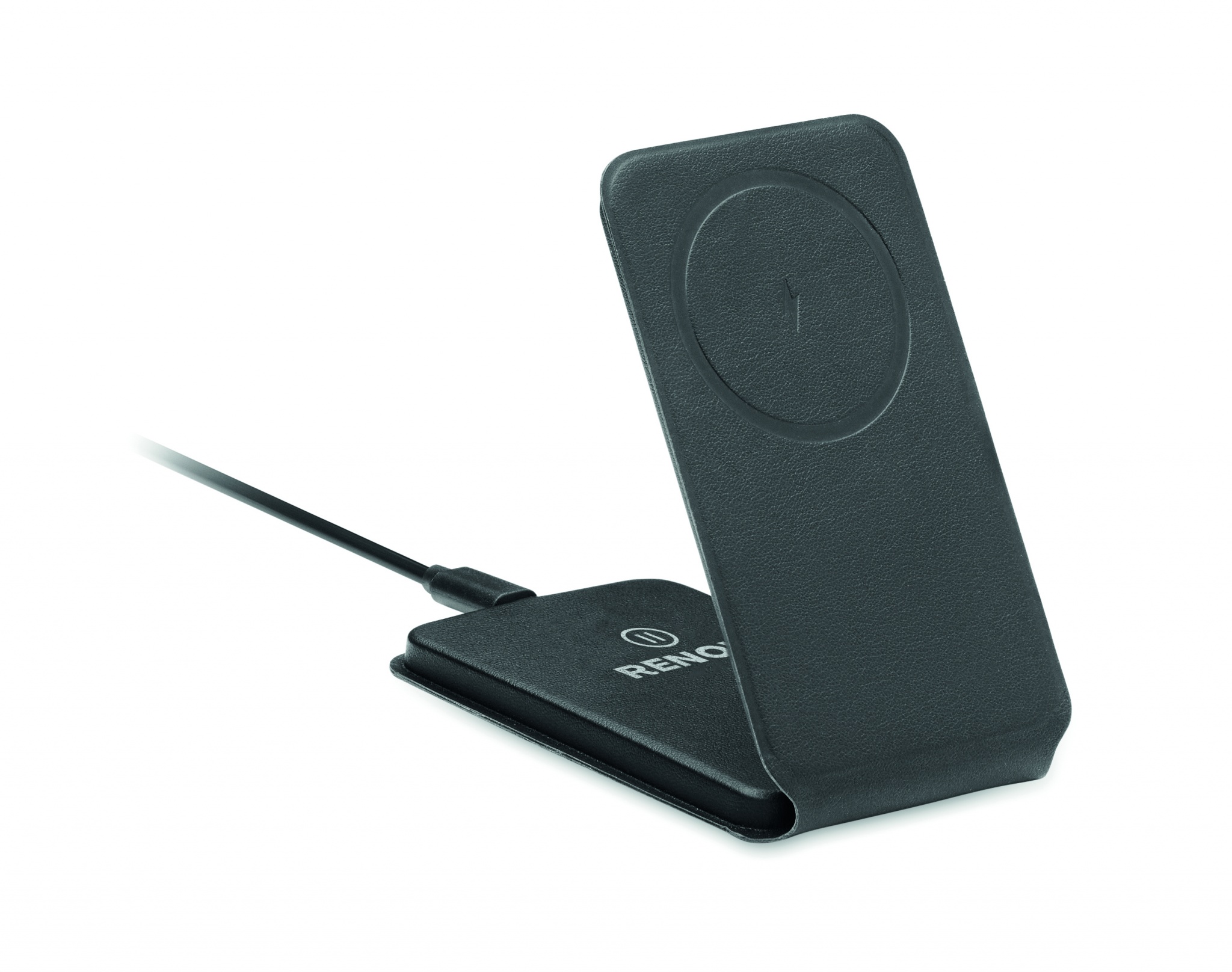 Foldable wireless charger 15W with magnetic phone stand in 58% recycled polyester and 42% PU.