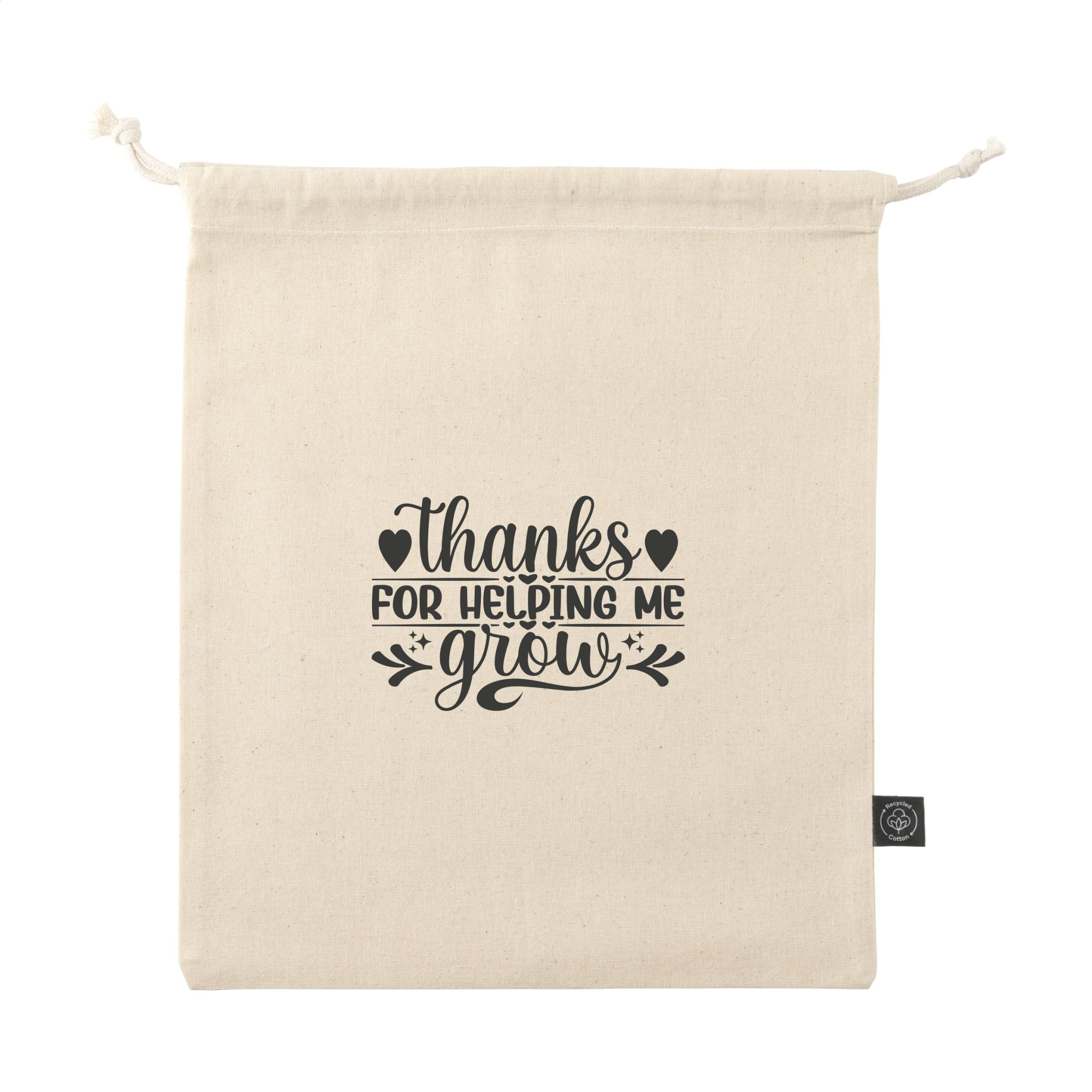 Gift pouch made from recycled cotton (150 g/m²). With drawstrings made from recycled polyester and recycled cotton. Original as gift packaging and suitable for storing items. GRS-certified. Total recycled material: 95%. Capacity approx. 1.5 litres.