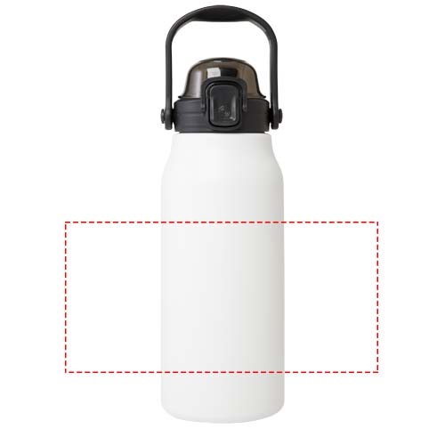 This large RCS certified recycled stainless steel bottle will keep you hydrated throughout the day in style. The copper vacuum insulation will keep drinks hot or cold for several hours, and the with its folding handle it is easy to carry around. The bottle is leakproof and features an easy button opening mechanism. Volume capacity is 1600 ml. Presented in a recycled cardboard gift box.
