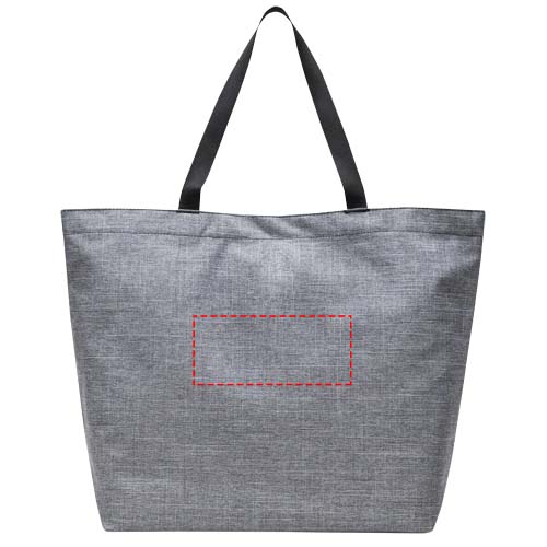 Simple design, recycled materials — this utilitarian hero is your do-it-all tote bag. The bag is crafted from EcoSystem™ 600D fabric and liner, both made from 100% recycled post-consumer water bottles. The tote bag has a metal snap closure and smooth webbing top-carrying handles for ultimate comfort.