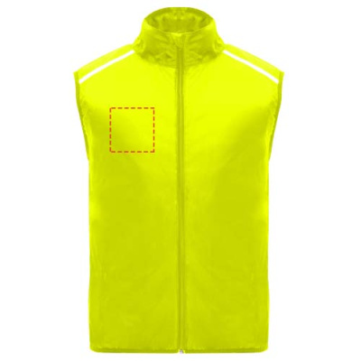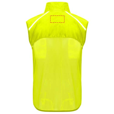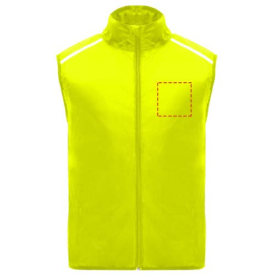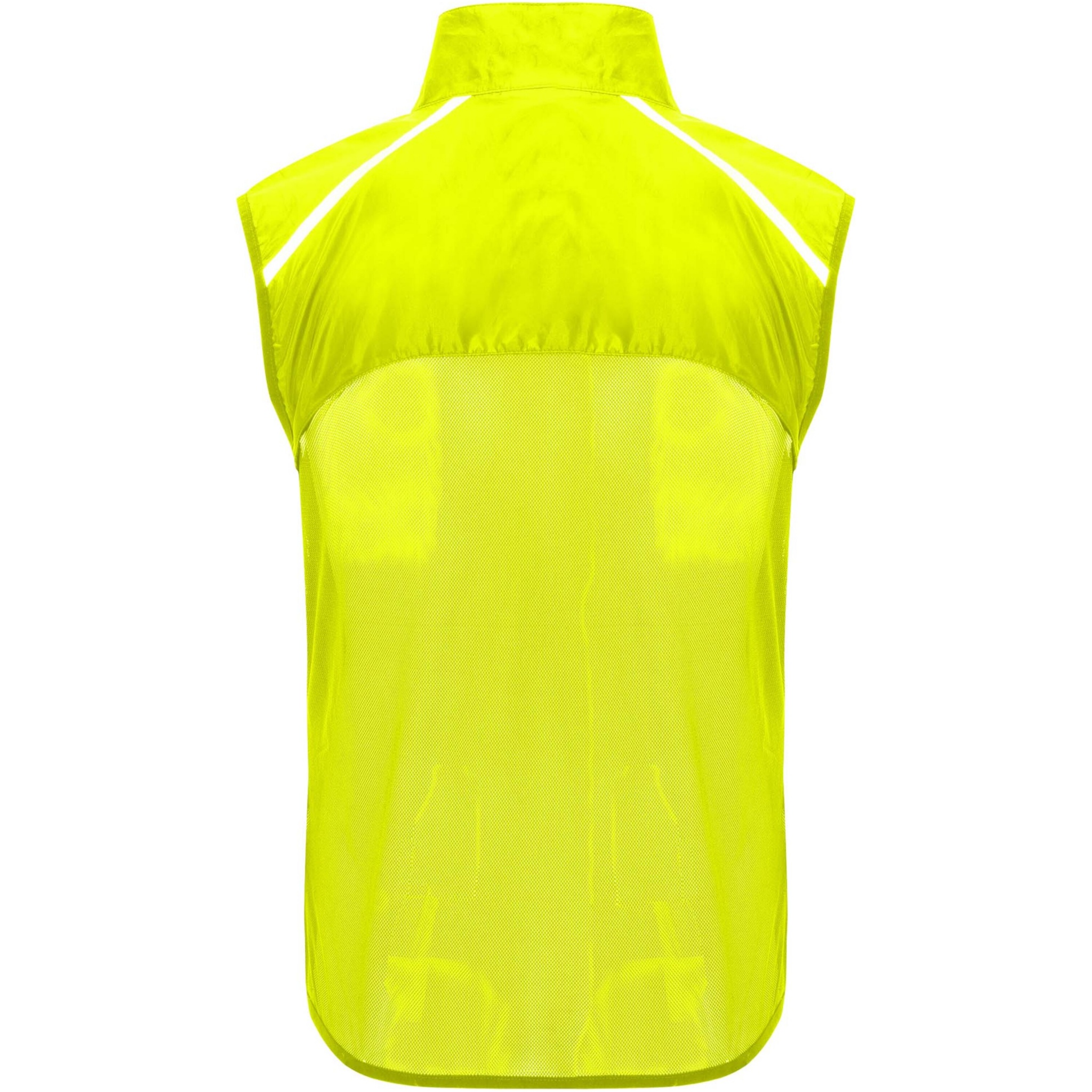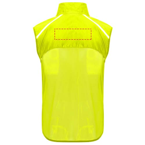 Wind-proof and breathable. Front zip with matching chin protector. Elastic binding at armhole and bottom. Bottom part of the back in microperforated fabric. High-visibility details on the top, front and back. Pocket with elastic strap to stow the vest and wear it on the wrist. Removable label.