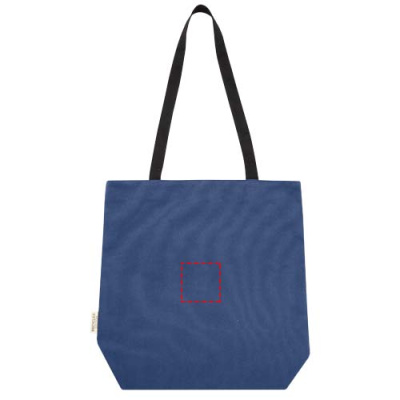 Tote bag made of GRS certified recycled canvas and GRS certified RPET lining. This versatile tote bag features a padded 15" laptop compartment and two sleeve pockets inside for a phone, wallet or accessories, and an easy button closure to the opening and comfortable cotton webbing handles. The decorative metal plate can make a logo shine through its subtle and matt finish.