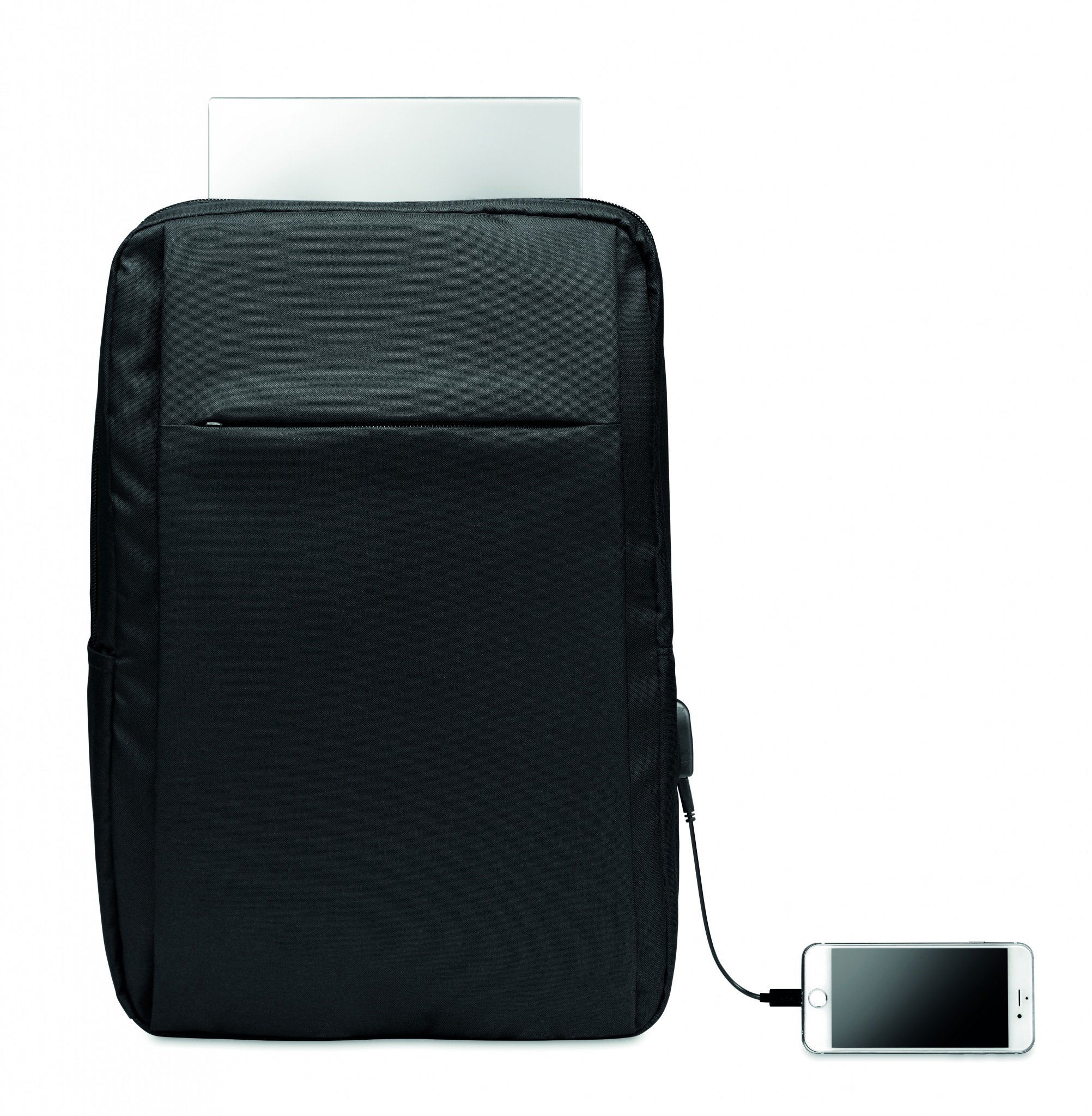 Laptop backpack in 300D RPET Polyester with padded shoulder strap including one main internal compartment for 16 inch laptop and a USB charging cable.