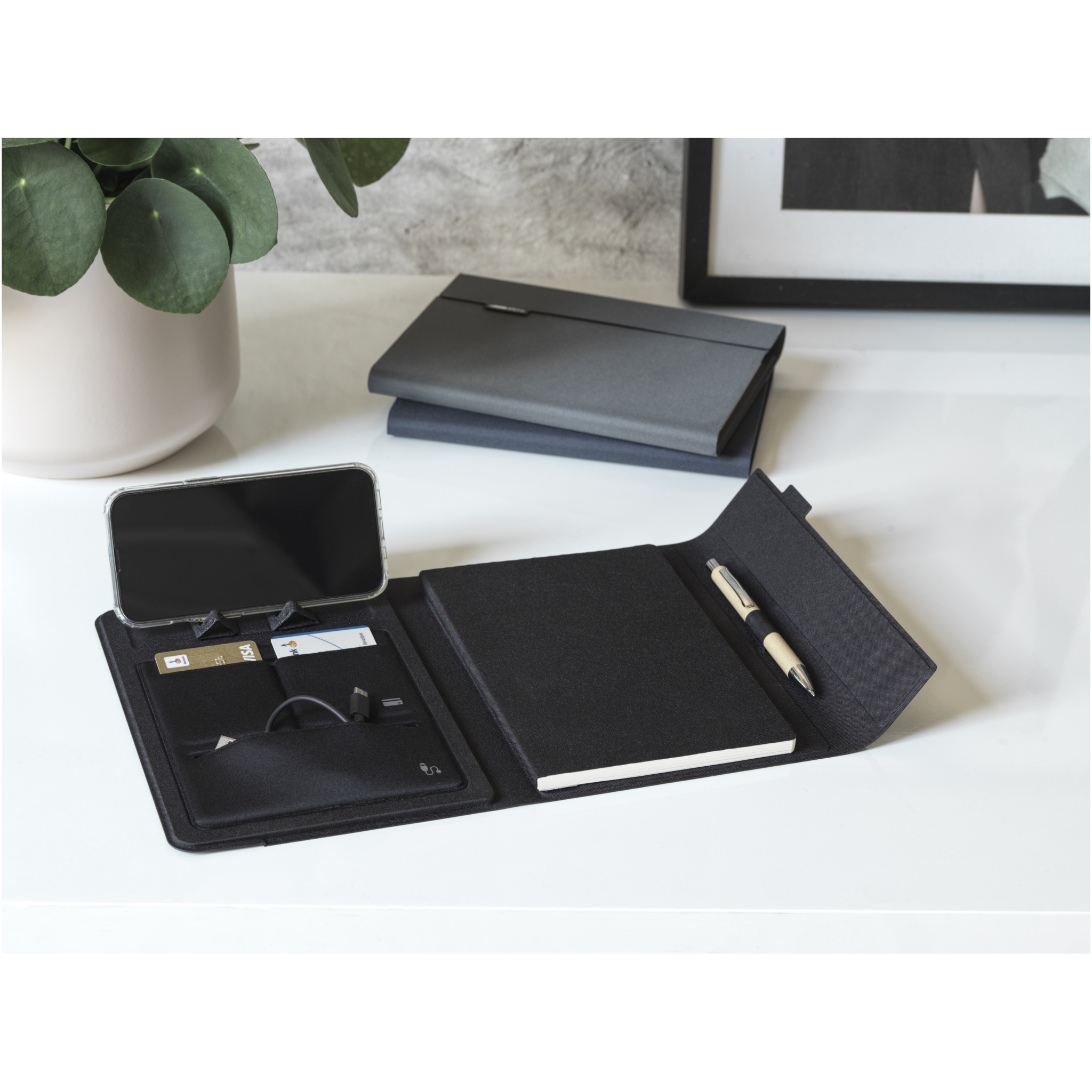 The RCS certified Liberto padfolio is partly made from recycled post-consumer polyester, making this padfolio a more sustainable choice since it helps to reduce the use of virgin raw material. Featuring a pen loop, accordion pocket, and 64 cream coloured lined sheets with 80 g/m2 recycled paper from sustainable sources. The pen and other accessories appearing on the photos are not included with this item.
