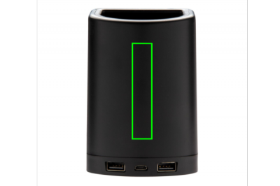 Charge your mobile devices without connecting a cable with this unique two in one desk accessory. Just place your mobile phone on the stand and wait for the charging notification to appear. The charger also allows you to store your stationery accessories like pens or pencils. This charger gives you the option to decorate with your own logo on the item, once connected it will light up for optimal exposure. Compatible with all QI enabled devices like android latest generation, iPhone 8 and up. Input: 5V/3A. Wireless Output: 5V/1A 5W. Including 150 cm micro usb cable.