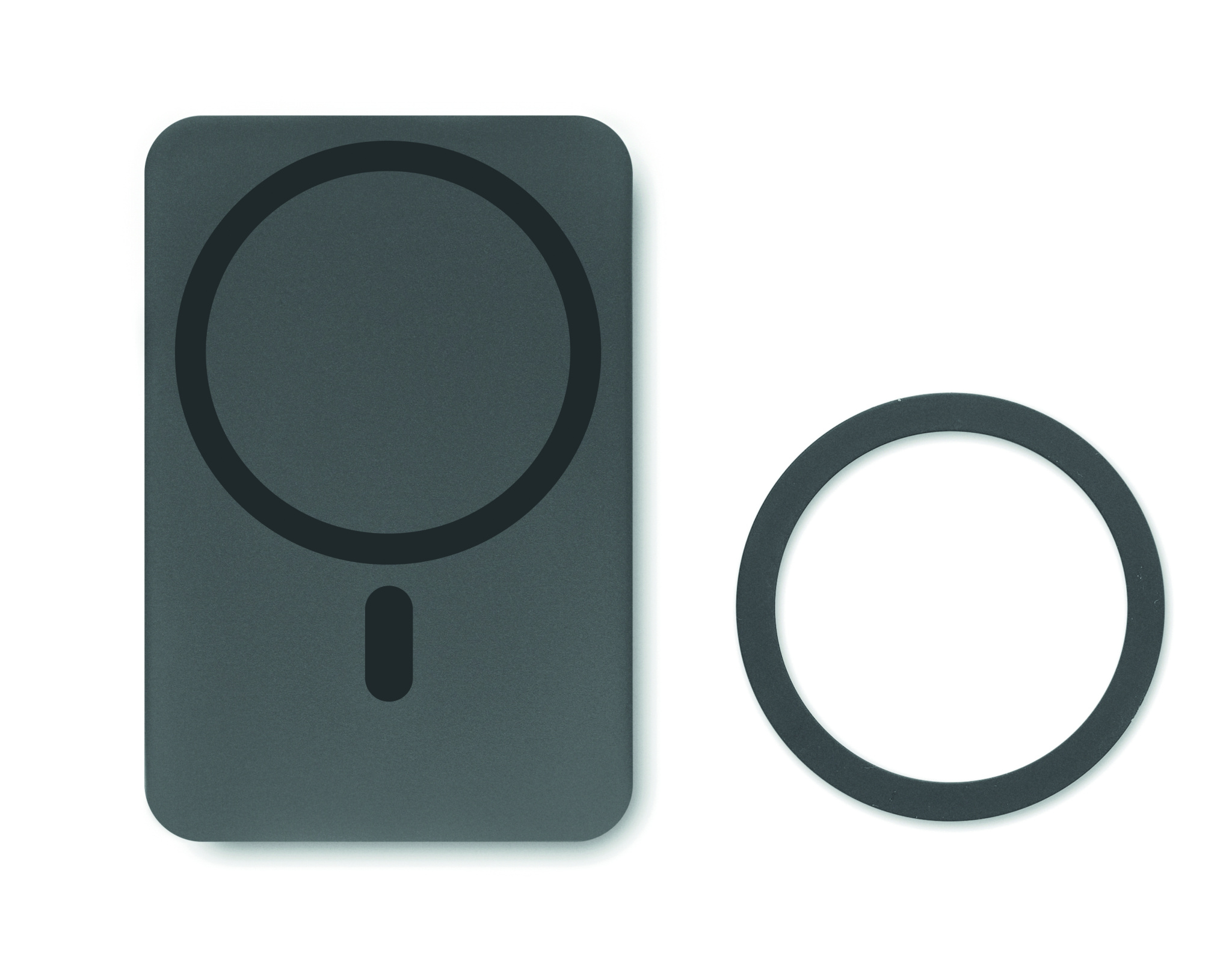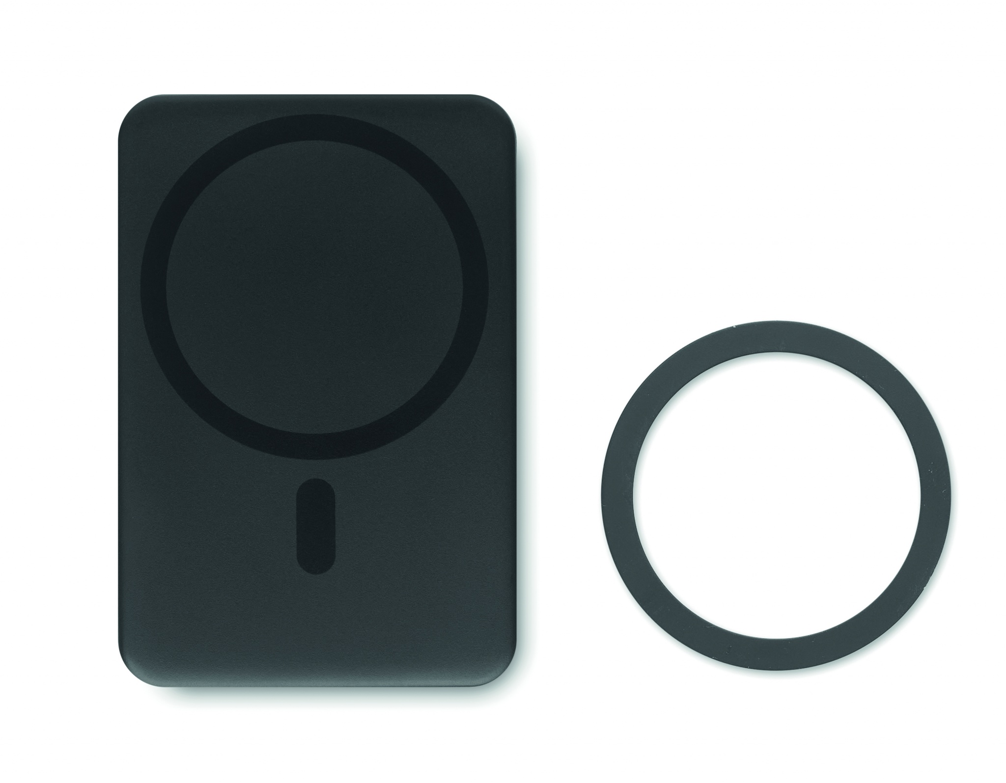 Magnetic wireless charger (15W) and power Bank (5000 mAh). Output: DC 9V/1.66A (18W) ideal for quick charging. Compatible with iPhone® 12 and newer. Including additional magnetic metal ring to support charging of other non-magnetic wireless chargeable phones. In/Output: Type-C. Power delivery (PD) support to charge the newest laptop MacPro®.