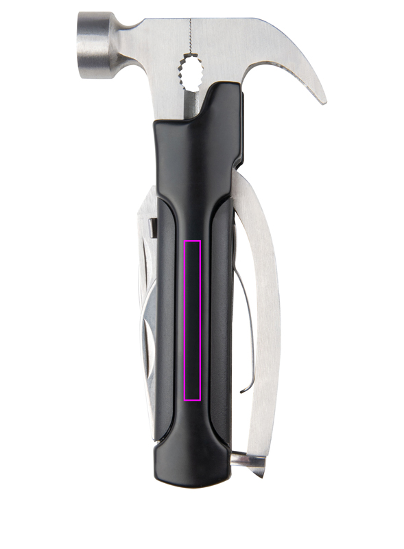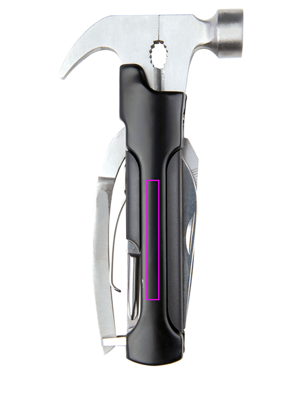 Multifunction tool (stainless steel) consisting of a hammer, a file, two blades, a saw, a slotted screwdriver and a bottle opener. Included is a matching case on which we print your logo in the center.