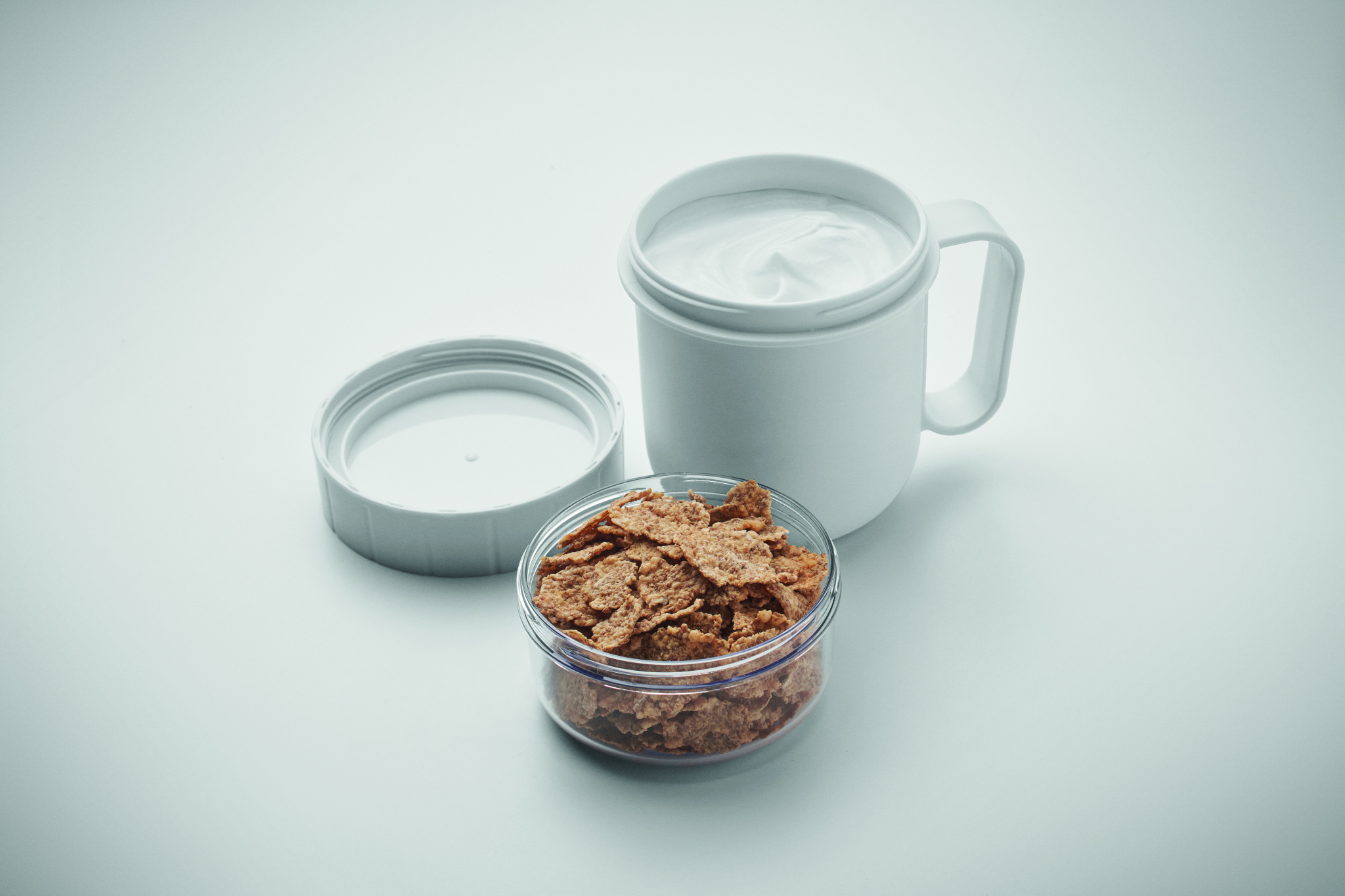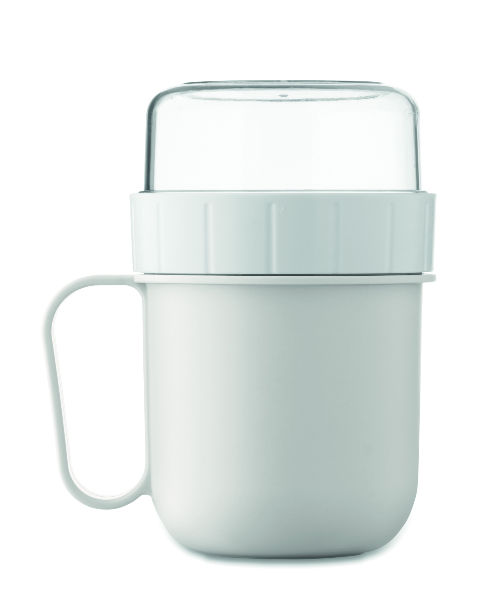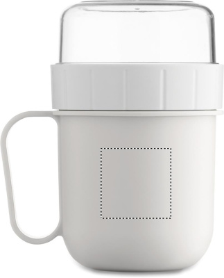 Breakfast or brunch on the go cup in PP and PS lid container. Consists of 2 individual containers to keep ingredients separate. Capacity: 450 ml and 160 ml. Leak-free.